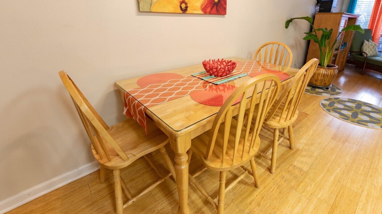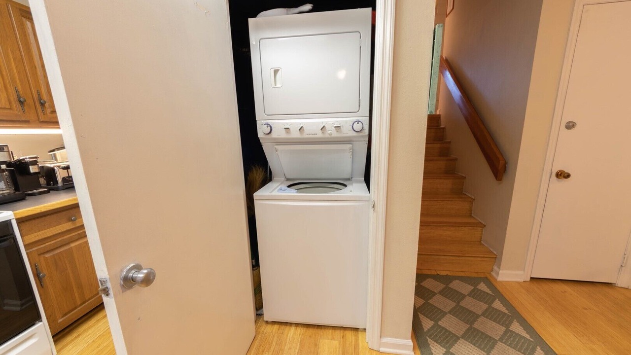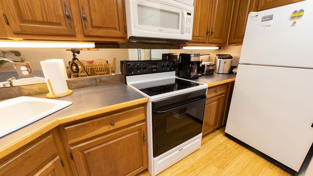 Downstairs from the master bedroom, you enter into the kitchen and dining area. The well equipped kitchen supplies all of your basic cooking needs and plenty of space to cook up the catch of the day! A dining table and 2 additional bar stools offer plenty of seating and a convenient washer/dryer is available for your use.