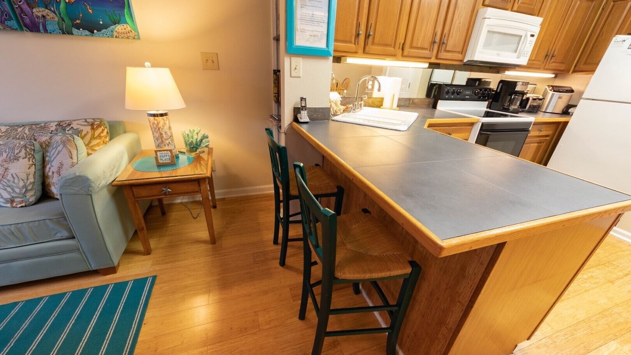 Less than two minutes will get your toes in the sand by way of the convenient boardwalk. First, you will find yourself at the gate of the large, community pool with lounge chairs, tables and umbrellas for your enjoyment. Also available is a large, spacious deck with 4 park style grills, a great place to meet other visiting families and share stories of your favorite Island experiences, things to do and places to eat!