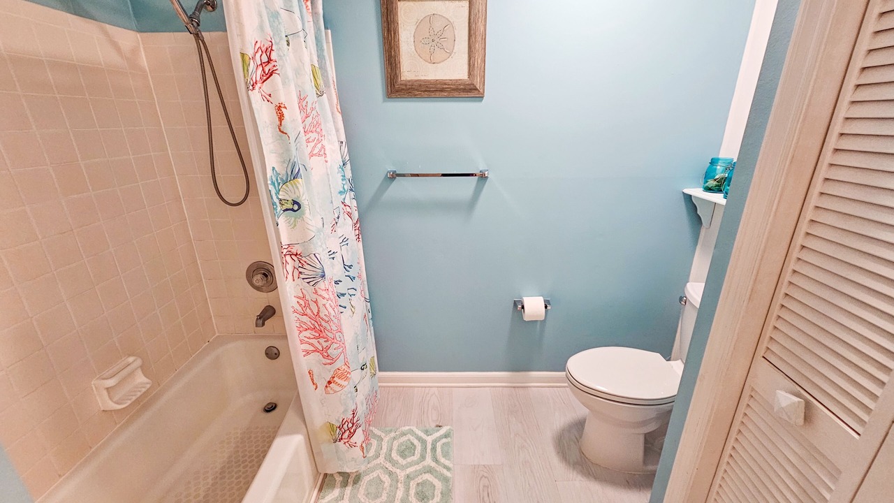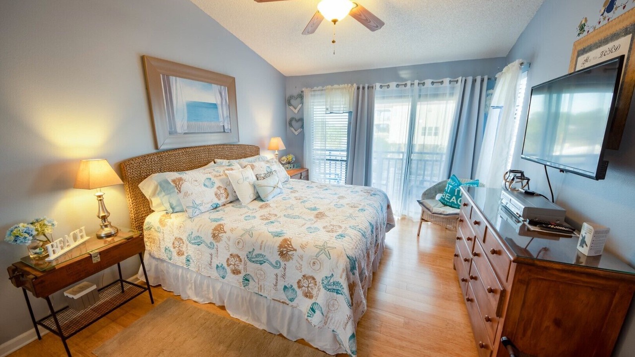 The master bedroom boasts a comfortable King sized bed where you can drift into a peaceful slumber as you listen to the nearby waves crash along the shoreline. A large sliding glass door opens onto a private balcony where you can revel in the sight of the Gulf of Mexico or the Apalachicola Bay! The master bedroom also provides privacy from the main living room and a flat panel TV for your convenience. A full bathroom is located just outside of the bedroom.