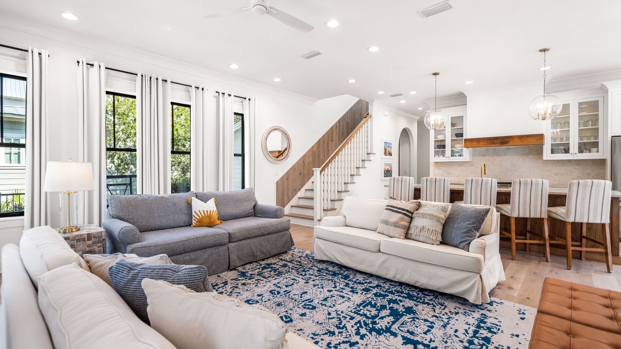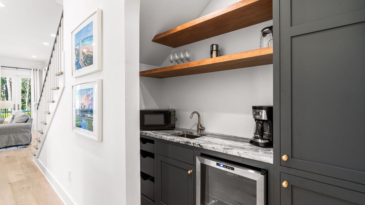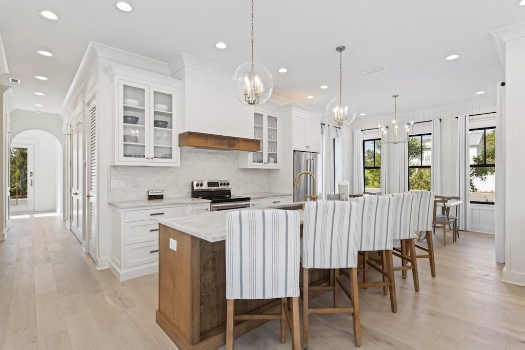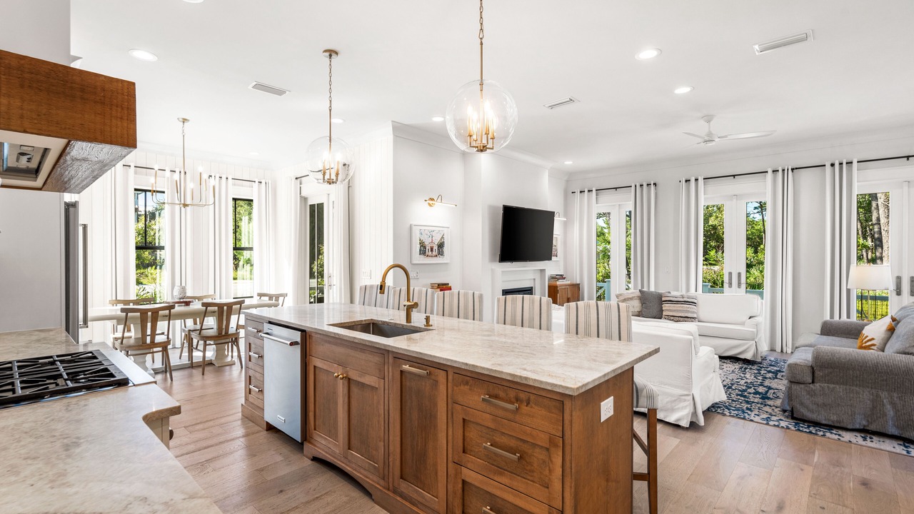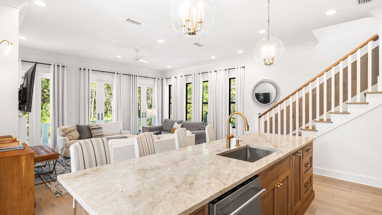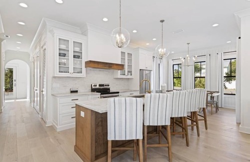 This luxurious new home offers an open floor plan which allows the custom-designed gourmet kitchen, dining room, and gathering room to flow seamlessly together. Enjoy the gorgeous special touches throughout this showcase home such as the gourmet kitchen's impeccable stonework, two-tone cabinets and island, upgraded Kitchen-Aid stainless appliances, brushed gold pendant lighting, and matching hardware fixtures. A custom wet bar and coffee area are through the archway under the staircase. The gathering area at "Haven & Shore" is perfect for spending time with your loved ones after a long day on the beach. It offers 3 sofas, is filled with natural light with two full walls of windows, and features a wall-mounted flat screen TV and French doors leading out to the back deck area. Off from the dining area is a beautiful screened-in Florida porch with outdoor seating.