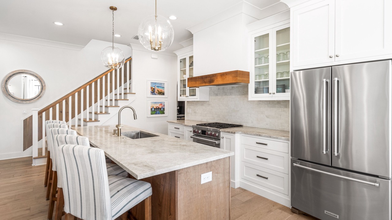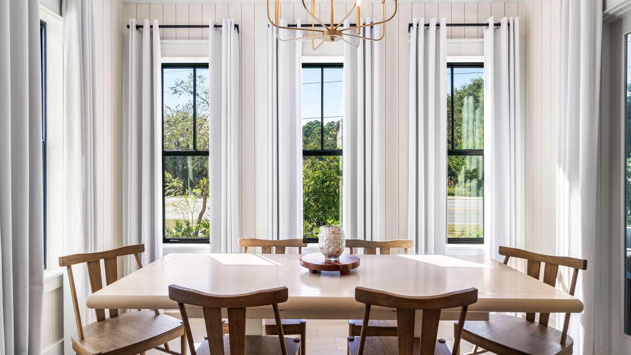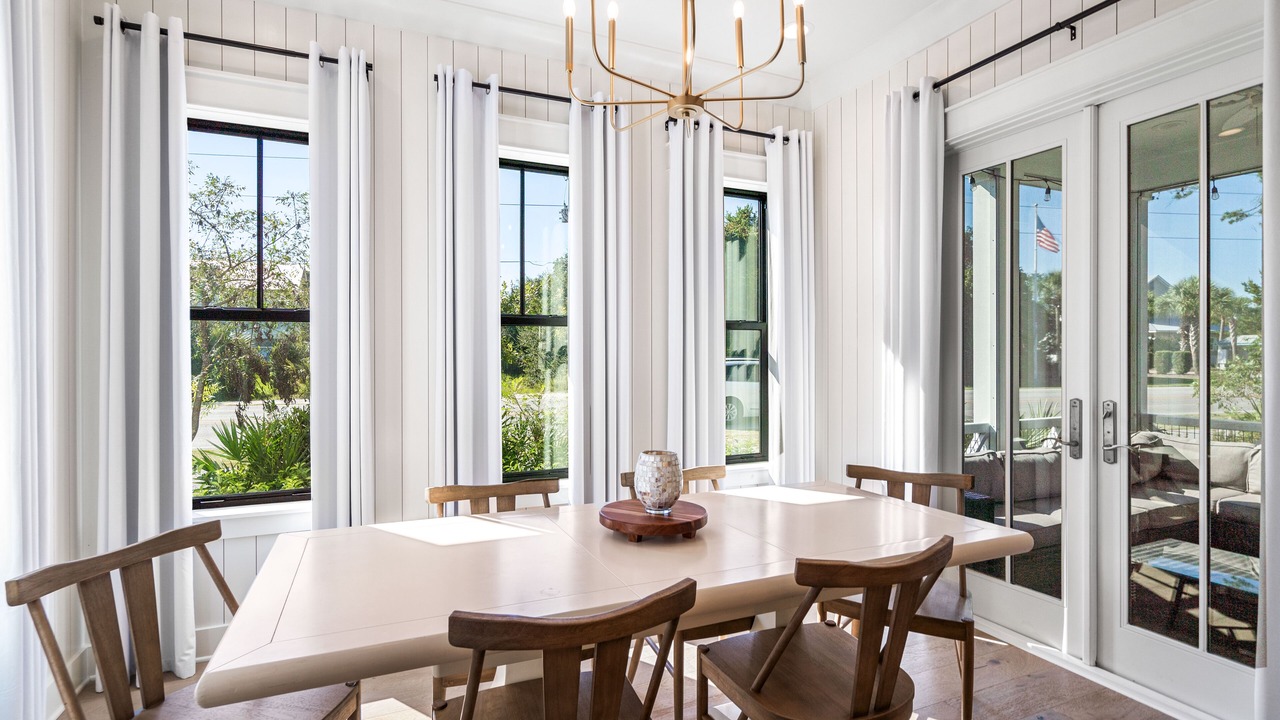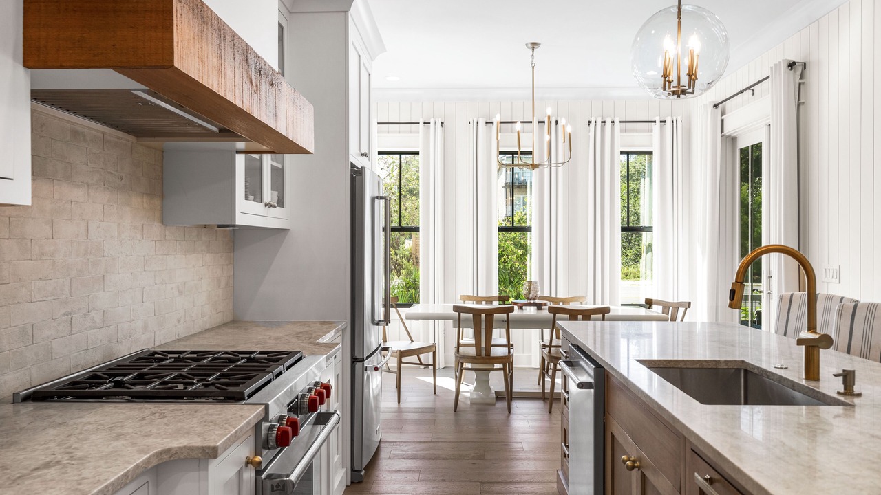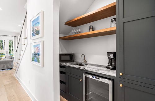 This luxurious new home offers an open floor plan which allows the custom-designed gourmet kitchen, dining room, and gathering room to flow seamlessly together. Enjoy the gorgeous special touches throughout this showcase home such as the gourmet kitchen's impeccable stonework, two-tone cabinets and island, upgraded Kitchen-Aid stainless appliances, brushed gold pendant lighting, and matching hardware fixtures. A custom wet bar and coffee area are through the archway under the staircase. The gathering area at "Haven & Shore" is perfect for spending time with your loved ones after a long day on the beach. It offers 3 sofas, is filled with natural light with two full walls of windows, and features a wall-mounted flat screen TV and French doors leading out to the back deck area. Off from the dining area is a beautiful screened-in Florida porch with outdoor seating.