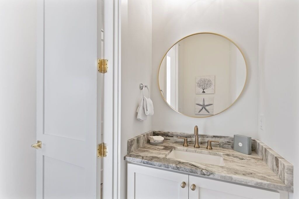 A contemporary coastal decor adorns the beautiful "Haven & Shore" home from top to bottom. The brilliant owners designed this home with a king suite on each floor so the main floor features a gorgeous king suite perfect for the family member who wants to avoid the stairs. The spacious private bathroom offers a dual sink vanity, LED mirror, and walk-in shower with custom tile work. Upstairs on the second level you can rest soundly in the master suite with a king-sized bed, flat screen TV, sofa, private balcony, and private bathroom. The bathroom offers a spa-like setting with a dual sink vanity, LED mirror, and waterfall shower head, walk-in shower with wave-specialized stone tiles, and a rectangle soaking tub with beautiful brush gold hardware under a Parisian beaded chandelier. Down the hall is the fully customized bunk room featuring a built-in bunk design with two twin-over-queen bunk sets and a stair set in the middle. This bedroom shares the guest bathroom with the 4th bedroom which features two twin beds. Both the bunk room and the twin room have wall-mounted flat screen TVs.
