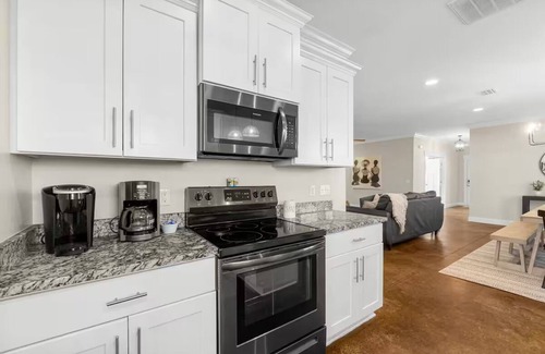 The home’s private in-ground pool is surrounded by a large patio with premium outdoor seating, perfect for lounging in the sun or enjoying a poolside meal. Just next-door to the home, a high-capacity ice machine provides all the ice you’ll need – no store runs required. The first floor features an open-concept layout with a fully stocked kitchen, dining area, and cozy living space for gathering and relaxing.