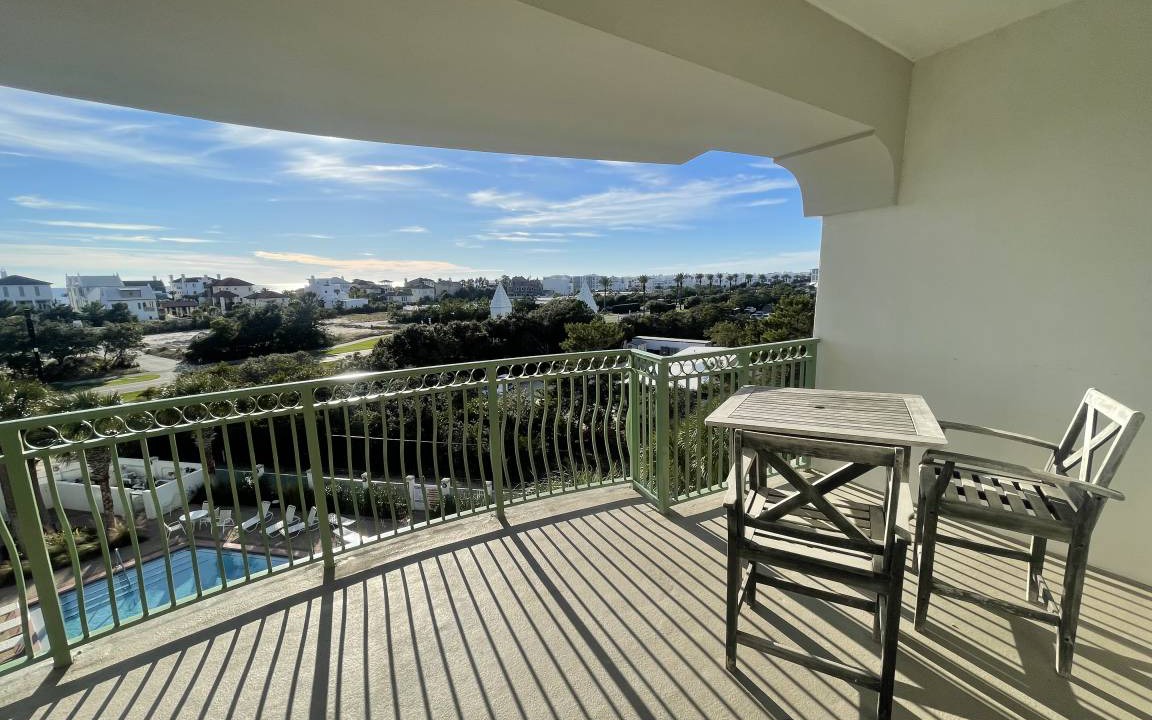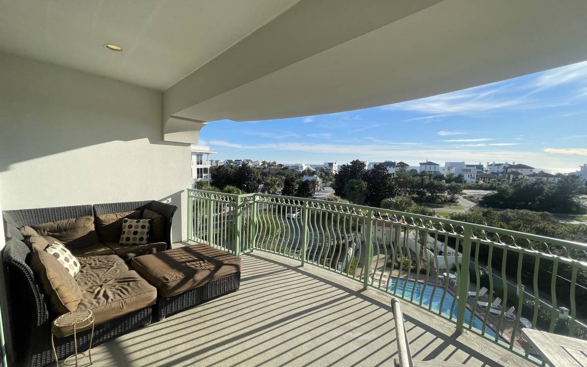 This lovely studio is perfect for a relaxing romantic getaway. The top floor center studio features an extra large balcony to soak in the fabulous views of the Gulf and overlooking the pool and hot tub. Imagine watching the sunset from the cozy patio sectional sipping a frosty beverage. The kitchenette has granite countertops and is equipped with a full-sized refrigerator with ice maker, microwave, toaster oven, coffee pot, and blender.