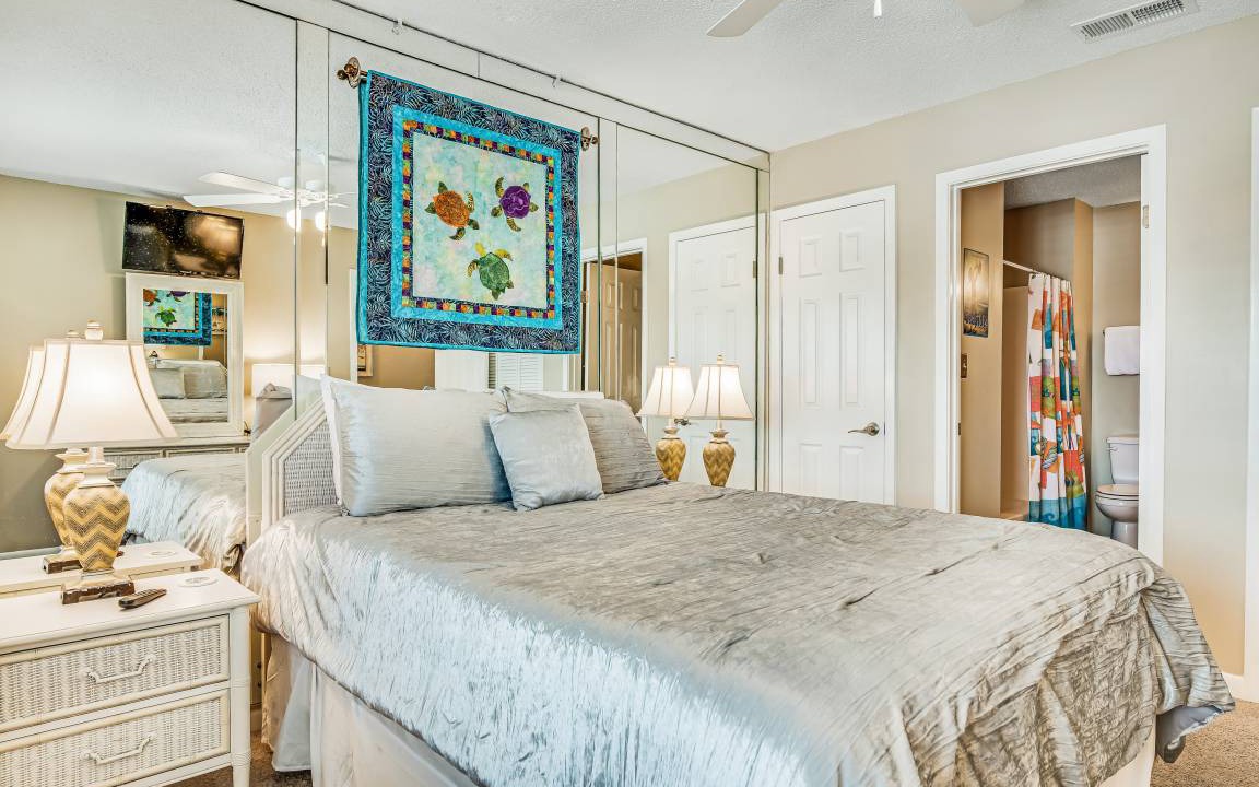 Ten miles northwest of the center of Panama City Beach and right across the street from beach access, this home for six is within easy walking distance of a grocery store, donut shop, and more. Plus, it's only minutes from a wide variety of shops, restaurants, and family-friendly venues like Wonderworks. On the way back home, make sure to visit the marine exhibits of Gulf World, as well as the shopping and rides of Pier Park.