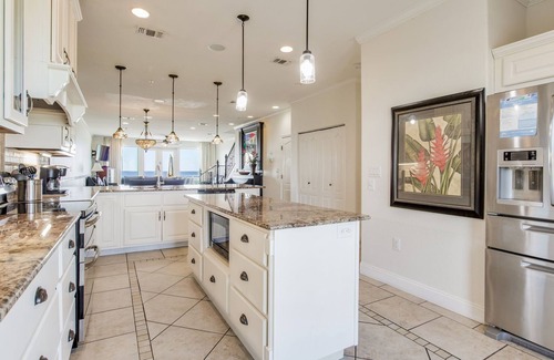 The dining area is perfect for large family meals, seating up to 12, with additional seating at the kitchen bar. The modern kitchen is equipped with granite countertops, an island, and stainless-steel appliances, making it ideal for preparing meals together.