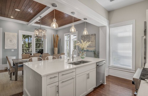 Luxurious contemporary 4 bedroom, 3.5 bathroom beach house with a new 6 Seat Golf Cart in the unique Inspiration neighborhood within the Sandestin Resort beach community. Contemporary and updated design and decorating. Recently renovated kitchen cabinets, island and countertops. This fabulously decorated beach home has every luxury amenity you need! The 4 large bedrooms include: 2 Master Suites each with King Size Beds, 1 Deluxe King Size Bed Guest Room and 1 Bunk Bedroom with 2 new Twin XL's over Queen Size Bunk Beds. The beautifully decorated 3.5 bathrooms feature designer soap, shampoo, conditioner, body wash & lotion, luxury bath towels as well as hair dryers. The open designed living room, dining room & professional kitchen with high ceilings is very comfortable for a few or perfect for entertaining several. The living room includes a cozy gas fire place and cable TV with all channels including HBO, Showtime, Cinemax, Starz, The Movie Channel, Netflix & Amazon Prime. The designer coastal dining table accommodates 8 and the kitchen bar has seating for 4. The professional kitchen is fully equipped with top of the line Sub Zero & Viking appliances, J.A. Henkels chef's knives and a complete set of Cuisinart professional cookware. A Sonos home sound system provides premium wireless music throughout the home, allowing you to play your saved or streamed music from your devices. The 2 relaxing outdoor screened porches, downstairs & upstairs, provide an experience of secluded serenity to enjoy the outdoors with screened protection. The porches feature teak & wicker deep seating, rockers, a hammock, teak outdoor dining and professional Weber gas grill with side burner. The rear porches enjoy a secluded view of Burnt Pine Golf Course's 16th hole and the front porch views the Choctawhatchee Bay. The beautiful white powdery sand and emerald water beach is just a short 5 minutes from the house. A 6 person Golf Cart is Included for your use throughout the resort with the beach, activities, dining & shopping just a few minutes to everything!