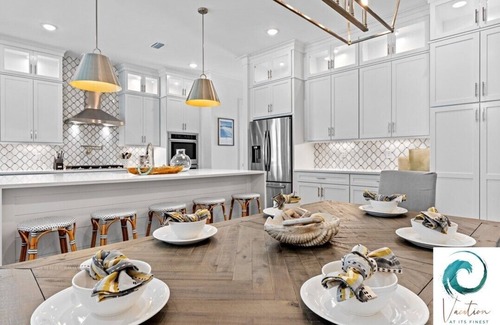 Vacation At Its Finest presents “Ash in the Sand,” a stunning 3300 sq. ft. three-story vacation home perfect for large groups. With six bedrooms, 4.5 bathrooms, and multiple living spaces, this home is designed for family fun, featuring an outdoor entertainment area with a heated pool, Smart TVs, a Ping Pong table, a Foosball table, gas grill, six bikes, and a six-seat golf cart.