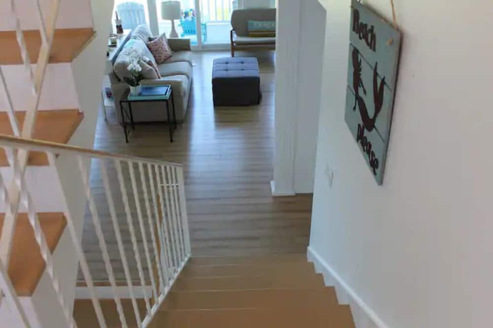 The second floor has a generously appointed kitchen with stainless appliances including a dishwasher, microwave, refrigerator/freezer, wall oven and a glass cook top. All utensils and cookware to prepare delicious meals is provided. The dining room table has seating for 6 and there is a breakfast bar in the kitchen with extra seating for 2. The living room is furnished with a comfy sofa, two swivel arm chairs, a side chair, loveseat and smart TV with dish network.