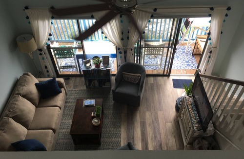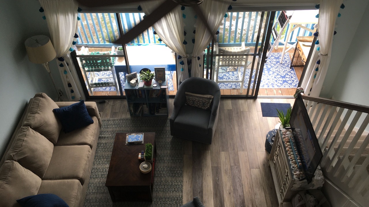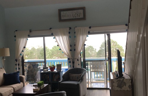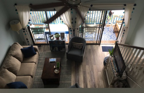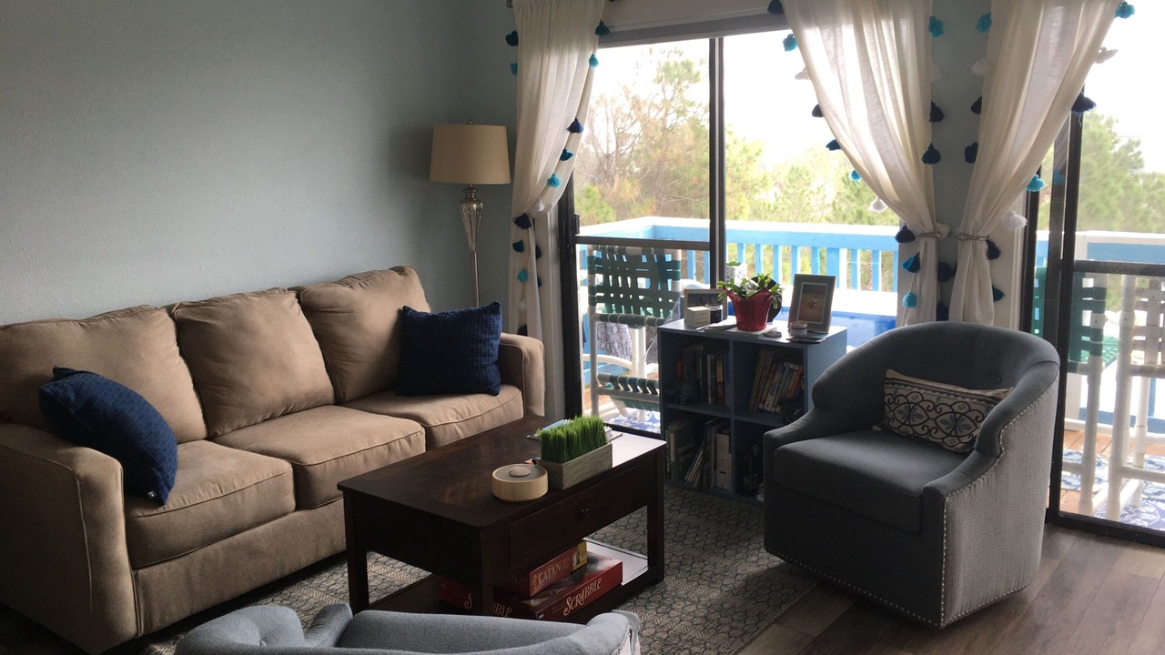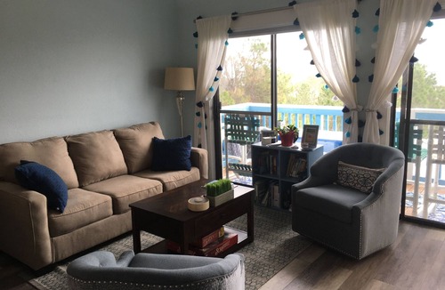 You will fall in love with our home away from home at the beach! Our cozy loft condo is located towards the end of the building and on the east end of 30A. Located a block from the Walton Dunes access, our unit is tucked away in a quiet building that overlooks a small lake to the east and views of the Gulf to the south. Beachy Basset has a mellow beachy vibe. The upstairs loft area has a queen size bed and a small couch with a fold out that comfortably sleeps one. The downstairs includes the bathroom and kitchen where you can prepare a delicious meal, a quick snack or heating up leftovers. Also on the first floor is the living area with a queen size sleeper sofa and Ikea stackable beds for more sleeping space. Our unit comfortable sleeps 5. And is located on the top floor of the building. An elevator is available for access as well as external stairs.