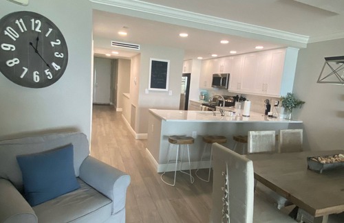 Beautiful remodeled kitchen and bathrooms , wood porcelain look tile thru out, new furniture and coffee bar
