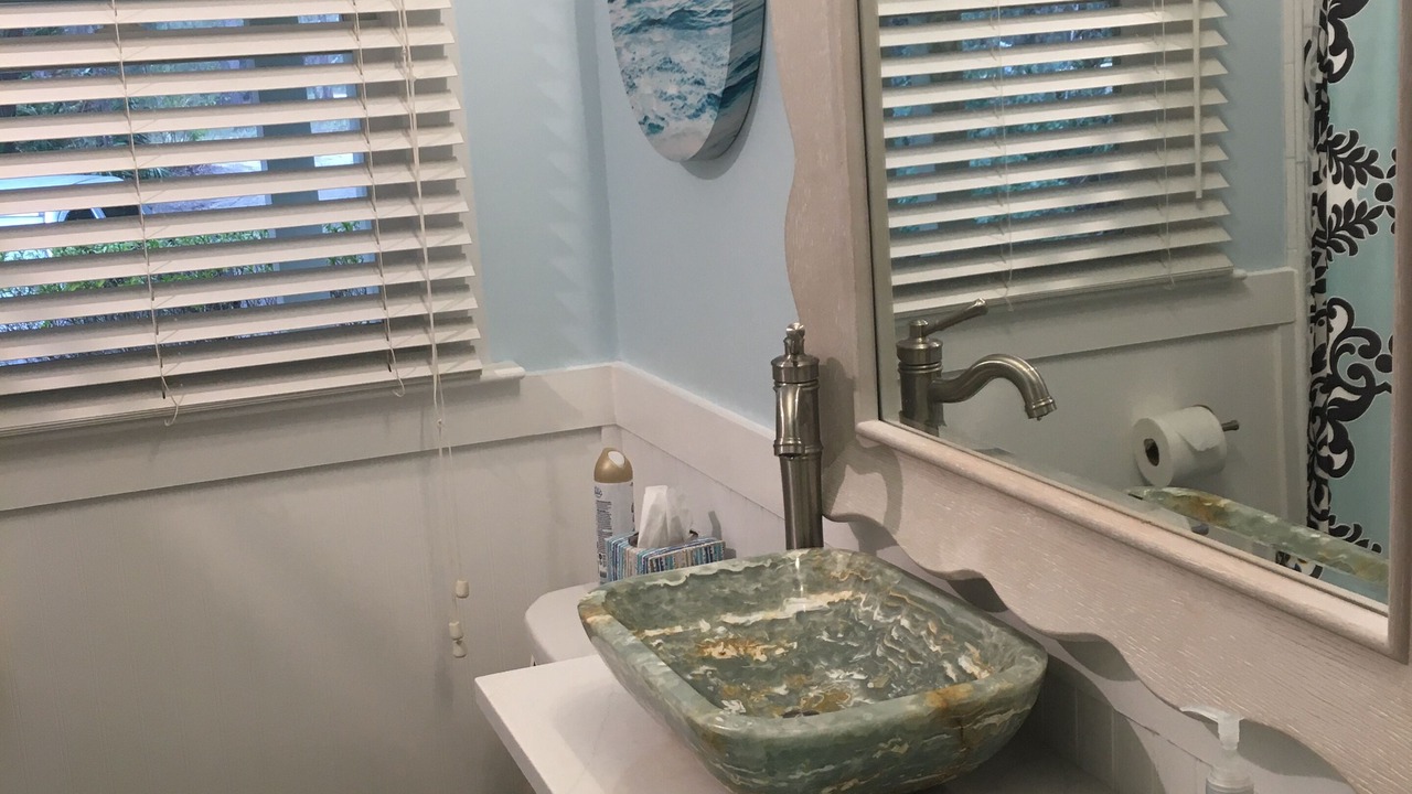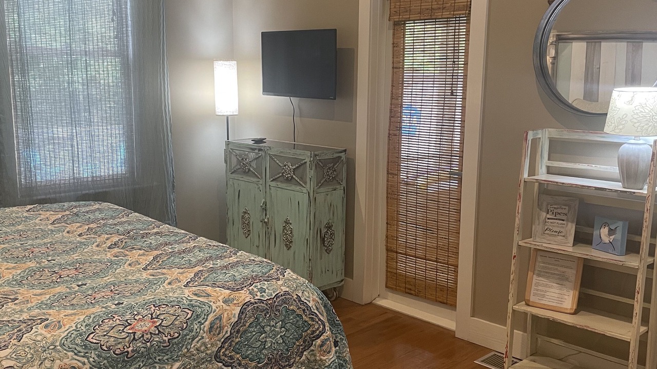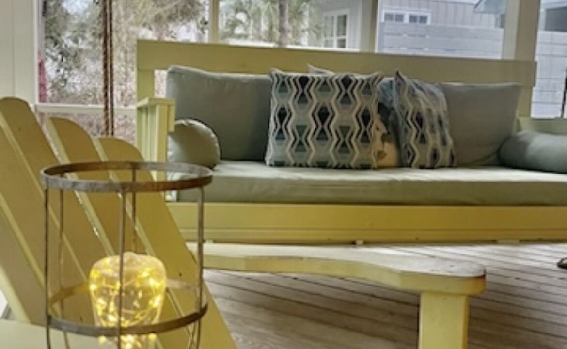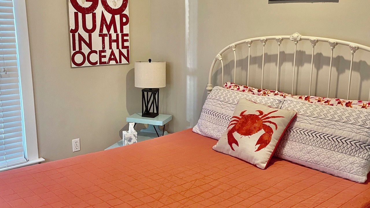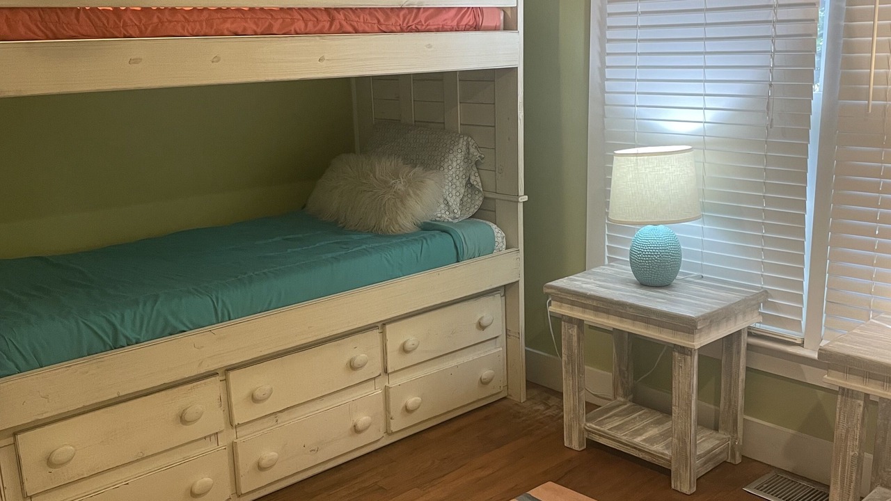 Master bedroom has 12 foot ceilings, king size bed, 2 closet dressers, and a flat screen TV. The private bath has a seperate tub and shower. This room overlooks the pool and has direct access to the large screened rear porch. The porch is furnished with ceiling fans, a second dining table and adirondack chairs for 4. The second guest room has a queen bed, and a flatscreen TV . The third bedroom has double bunk beds that will accommodate 4, and a flat screen TV cabled for video game consoles. These two bedrooms share a hallway bath with double sinks.