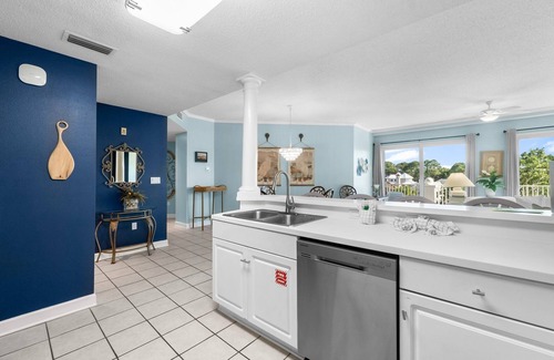 The kitchen offers white appliances and cabinets, and breakfast bar. The dining area, along with the breakfast bar, accommodates seating for eight. The living room has an armoire that opens up to a flat-screen TV, DVD player, I-pod stereo and board games. Part the custom drapes and you’ll discover an expansive balcony with breathtaking views that overlook the palms and rooftops of the Blue Mountain Beach community. A patio table and chaise lounge chairs offer a great place to just kick back with drinks after a day at the beach. Beach service included for 2025 season.