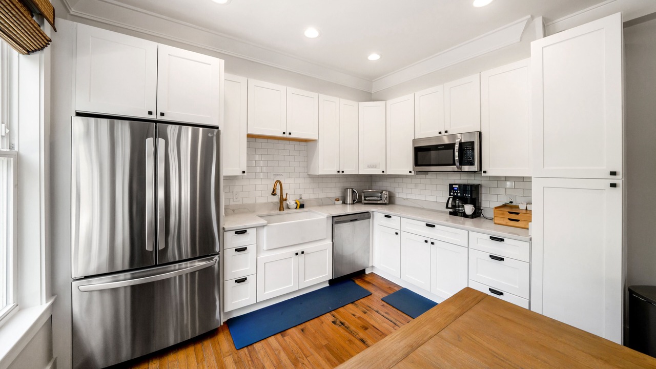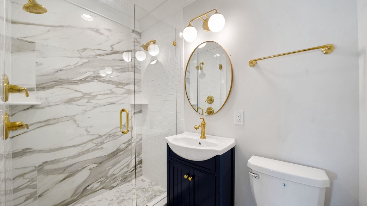 - Features an elegant all-marble full bathroom with a walk-in shower.