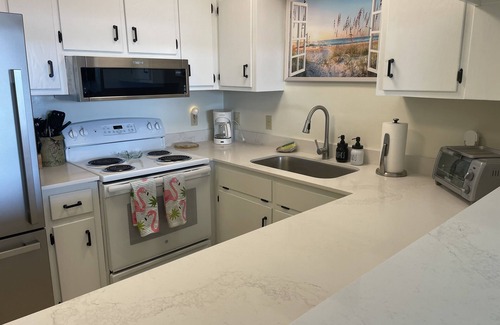This one bedroom condominium offers a great view of the Carrabelle River and all of the beautiful boats docked at the Moorings marina. The bedroom has a queen size bed and a bunk bed with a queen on the bottom and a twin on top and can sleep a maximum of 5 people. There is a sofa in the living room and a full kitchen and bathroom. 1 large smart TV in the living room with cable and streaming and 1 smart TV in the bedroom for streaming only.