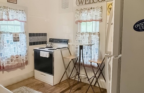 In the mornings, sip coffee on the front porch, and in the afternoons, retreat to the breezy screened porch. In the evenings relax under the starlit skies and loosely strung lights beside the fire cauldron or just lay back on the hammock or in one of the Adirondack chairs. This time capsule cottage comes adeptly furnished for both casual downtime or lively conversation. Should you enjoy preparing your own meals, you'll find this petite kitchen still offers you a host of kitchen appliances and modern conveniences. A newly upgraded 2024 private washer/dryer set makes doing your laundry before heading home a breeze and the mounted air-conditioners provide an extra layer of comfort during your stay.