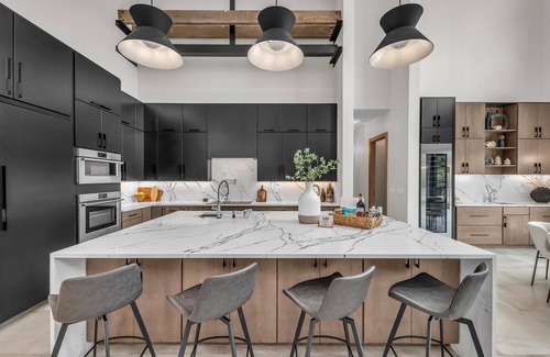 Coastal Luxe features original, reclaimed natural oak structural beams from an early 1900s home. These elegant features harmoniously coexist with sleek dark metal accents infused with subtle hints of glamour. The combination of these materials effortlessly complements Coastal Luxe’s overall stunning aesthetic. This exquisite home boast 4,300 sq ft of living space and comprises 5 generously sized bedrooms and 5 bathrooms, 4 of which are en-suite configurations. Bathrooms on each floor are adorned with custom imported Spanish tile. Crafted with hosting and entertaining in mind, the inviting living space features soaring 22-foot ceilings, with a striking floor-to-ceiling fireplace as its focal point, a custom built-in nook for added character, and abundance of natural light. The state-of-the-art kitchen is a culinary enthusiast's dream, offering layered custom cabinetry with ample storage, a generous island featuring waterfall edges and a unique backsplash, and top-of-the-line Fisher & Paykel appliances. A butler's pantry serves as a secondary storage and cooking area, complete with a dishwasher drawer, cooling drawer, a second wall oven, and a built-in coffee maker all for your convenience. This home is perfect for family & friends looking to enjoy contemporary luxury and relaxation near Sarasota’s miles of beautiful sandy beaches, golf lover’s paradise, rich cultural heritage, and world-class amenities!