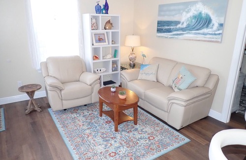 Immaculate apartment above garage, behind charming Craftsman bungalow. Wake up in this bright and airy apartment, ( 675 sq feet) and make breakfast in the full size kitchen. Take your coffee outside and sit by the fountain as you enjoy the morning stillness. After a fun day at the beach or exploring historic Pensacola, relax and watch TV or read a book without the annoying noises of a hotel. When it’s time to retire, snuggle in this comfortable queen size bed with pillow top. Six pillows of varying degrees of firmness provided so you can find one just right! Fold-out twin bed with memory foam topper if you have third guest. Walk in shower with glass doors provide open spacious feeling. Perfect for parents visiting military members, or couple coming in for one of our great festivals!