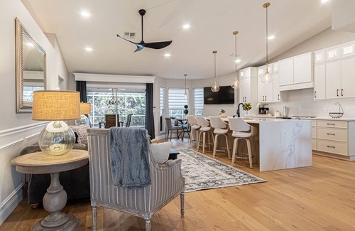 The well appointed modern kitchen has been newly remodeled to create an open living space. This gorgeous renovation sports a huge island with bar seating as well as a breakfast nook with smart TV.
