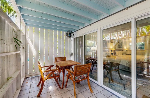 Enjoy a tropical getaway to Key West at this adorable and colorful ground-floor studio, complete with a well-equipped kitchenette and a view of the well-maintained courtyard and shared heated pool.