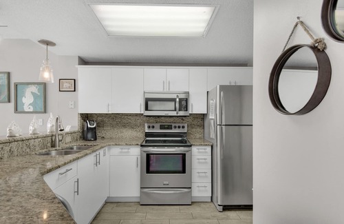 The condo has the hardwood-looking tile throughout along with new paint. It is decorated with soothing coastal blues and tans. The kitchen has granite countertops and stainless steel appliances. There is a coffee maker as well as a Keurig. You can enjoy the stunning view of the ocean while sitting in the living room, kitchen table, or while preparing your meal in the fully stocked kitchen!