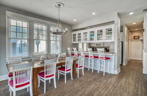 Discover hardwood flooring, 11-foot ceilings, and beautiful furnishings as you step through the front door of this two-story beach cottage. Gather in the open gourmet kitchen, dining, and living area on the first floor. The coastal chic dining table seats 8 and the breakfast bar accommodates 5. The living area is equipped with a queen sleeper sectional sofa to provide additional accommodations. A 55" smart tv with Direct TV cable, Xbox for gaming or watching DVDs. Enjoy the cool vibes and gentle breezes on one of three spacious porches. A propane grill is available just off the kitchen for preparing your family's feast. .
