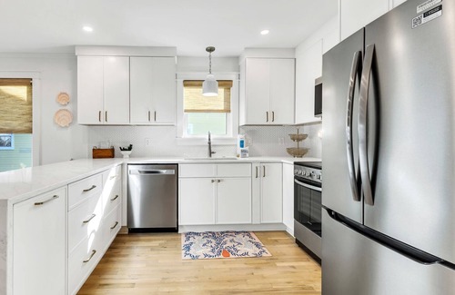 Step inside to discover a tastefully designed open-concept living space, bathed in natural light and adorned with coastal-inspired decor. Freshly remodeled, every corner of Little Wing exudes elegance and modern comfort. The spacious living room is perfect for unwinding after a day of beach adventures, featuring plush seating and a large flat-screen TV for movie nights. The fully equipped kitchen is a chef's dream, complete with high-end appliances, sleek countertops, and a breakfast bar for casual meals or morning coffee.