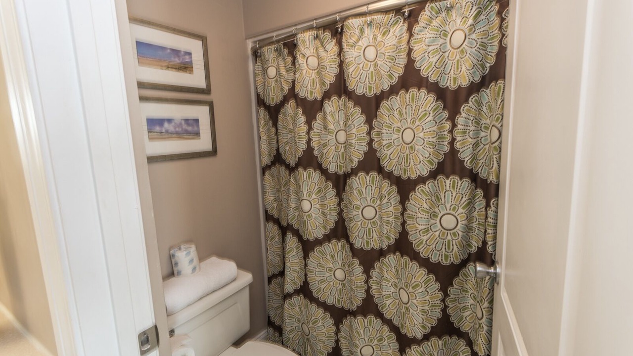• Guest Bedroom: Perfect for families or friends, this room includes a queen-size bed, twin bunk beds, a flat-screen TV, and access to a second full bathroom with another tub/shower combo.