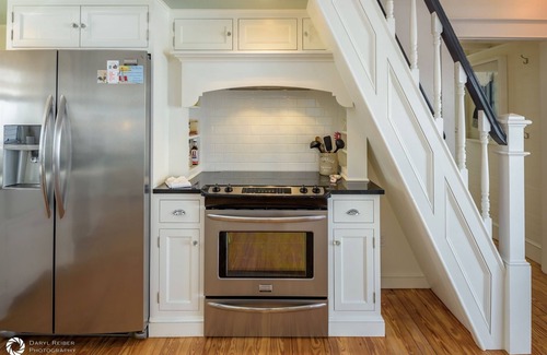 The master bedroom has a king bed with an en suite bathroom. The second bedroom has a queen bed and is adjacent to a second full bath via a private hall. There is a great sleeping loft open to the common room below which is accessed by funky alternating ship ladder stairs, custom-made as well. The loft has two twin extra long beds with storage drawers beneath. The loft and both bedrooms have top-of-the-line Simmons AirCool ComfortPedic memory foam