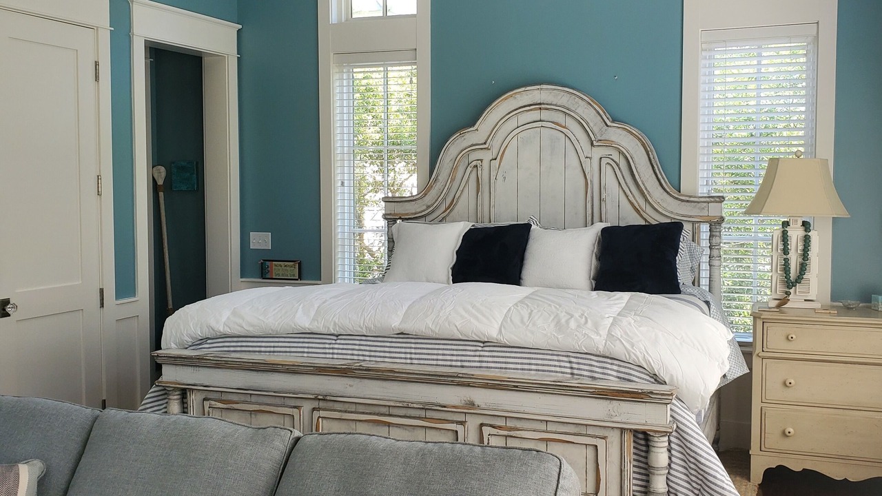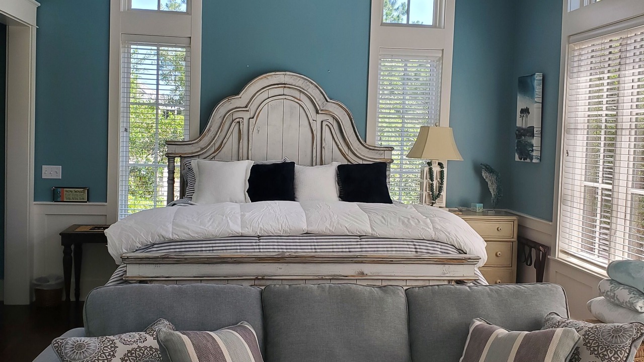 This Luxurious Carriage House, 'Goin' Coastal' in WaterColor at 142 Pond Cypress Way in Santa Rosa Beach, FL 32459 is the perfect vacation rental. It is separate from the large private home and its spacious studio-like room with 15-foot ceilings and gorgeous hardwood floors fits the needs of friends on a get-a-way, a couple on a romantic weekend or a small family with room for a couple of kids. In addition to the plush king bed there is also a queen convertible sofa bed and plenty of room for cribs or extra luggage! Keep in mind that this is one big room so the sleeper sofa is in the same room as the king bed ;)
