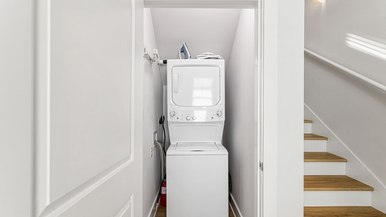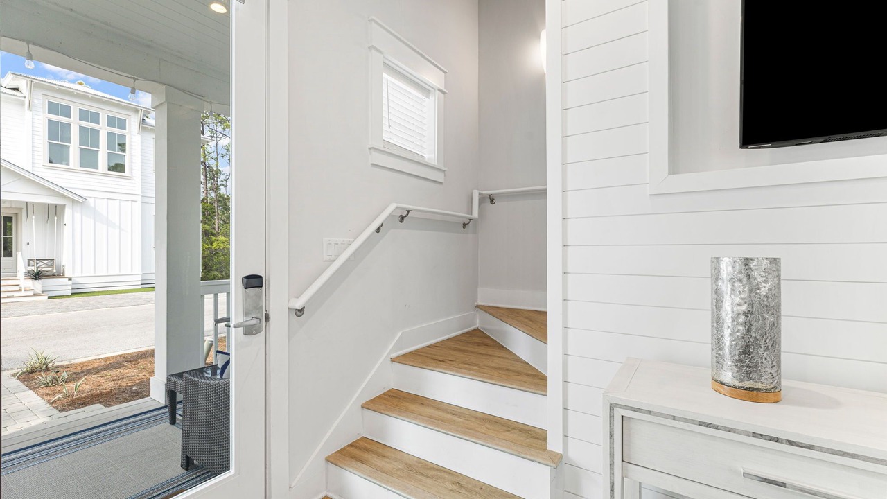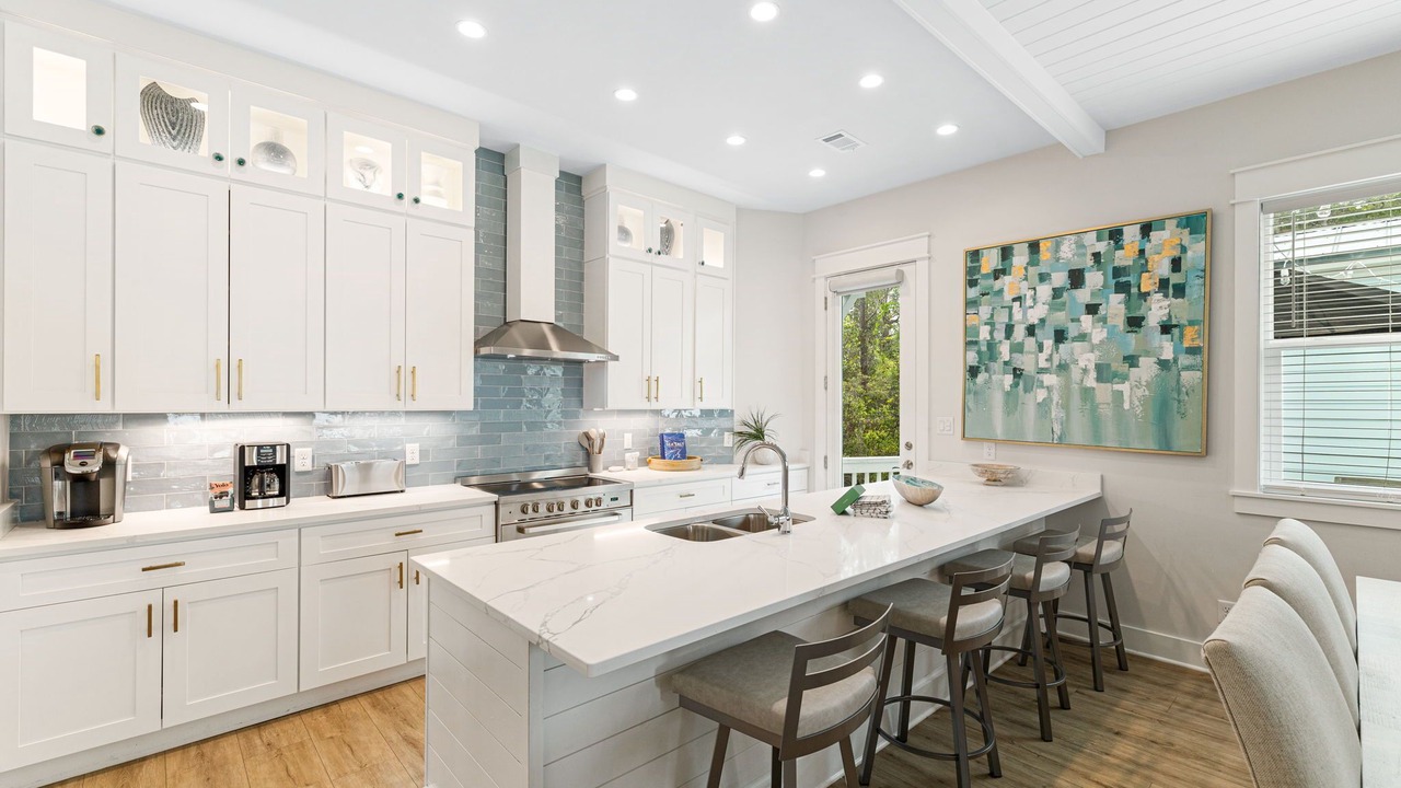 A bright and beguiling exterior greets guests upon arrival at this 3-story home. Curl up on the front porch’s cushioned seating to welcome the morning with a cup of coffee. Inside, hardwood floors and soothing colors seamlessly combine the open concept great room. In the living space, a shiplap wall accents the streaming-equipped TV, and a comfortable sectional and armchairs offer seating for the whole group. The kitchen is a chef’s dream with quartz countertops and high-end appliances—making it easy to gather for a shared meal at the 8-person dining table. There are 4 additional seats at the breakfast bar. On the back deck, delight in an evening cookout with the natural gas grill and dine under the setting sun at the 4-person outdoor table. An outdoor shower makes rinsing off post-beach a breeze. For sleeping accommodations, there is a queen sleeper sofa.