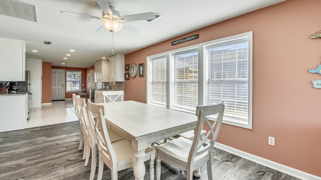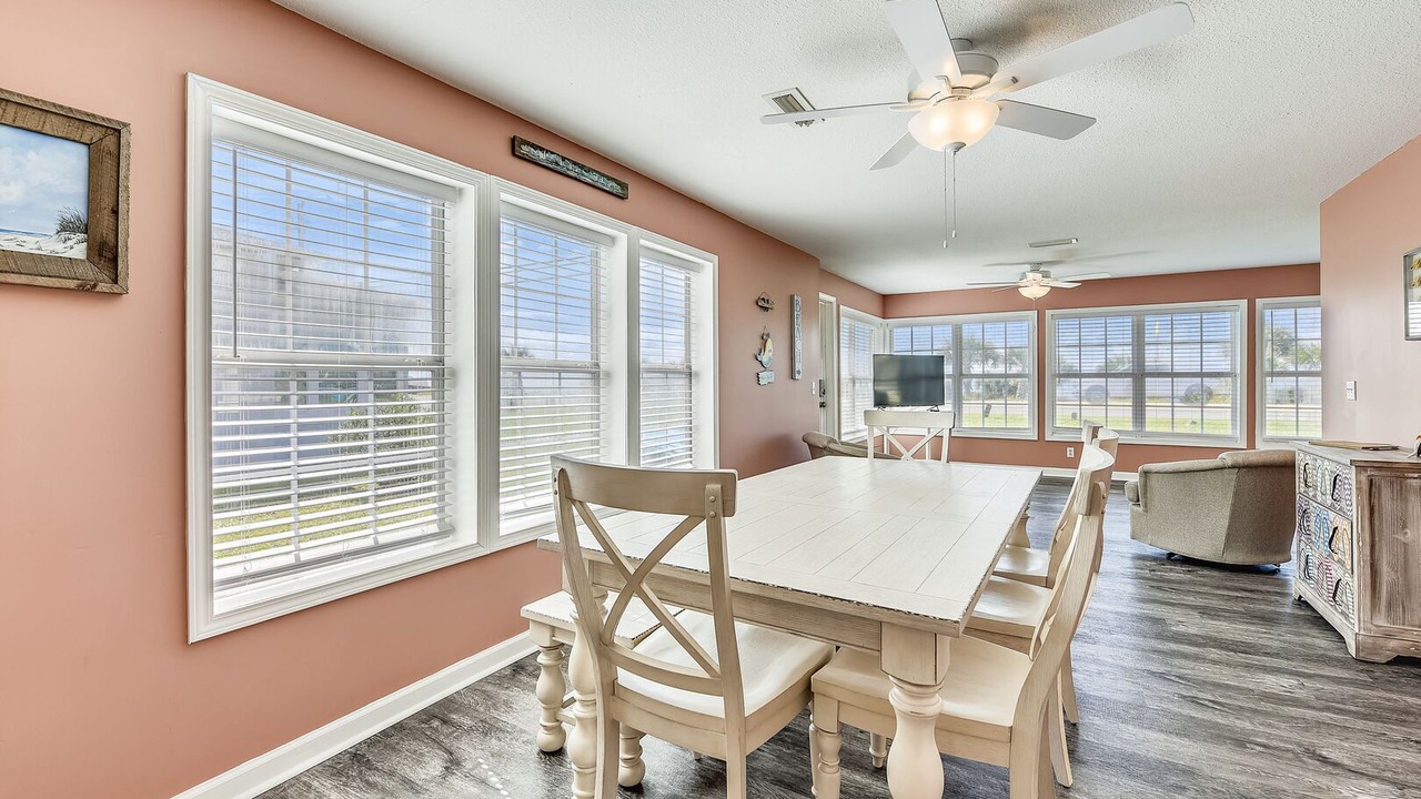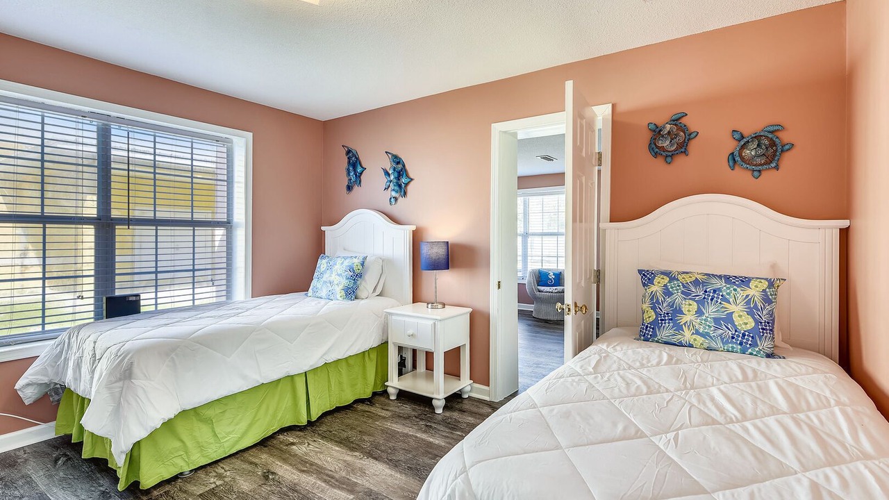 The private dining area features a coastal table and décor, creating the perfect ambiance for family and friends to gather and enjoy meals together. The master bedroom features a king size bed, a flat screen TV, and an ensuite bathroom with a walk-in shower. Bedroom 2 also has a king size bed and a flat screen TV, while Bedroom 3 offers a queen size bed and a flat screen TV. Bedroom 4 has 2 twin size beds and a flat screen TV. There are 2 additional bathrooms with walk-in showers, ensuring everyone has plenty of space and privacy. Other amenities of Coral Cottage include a washer and dryer, ensuring you have everything you need for a comfortable and convenient stay.