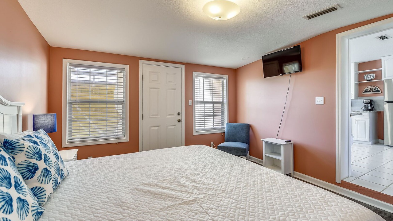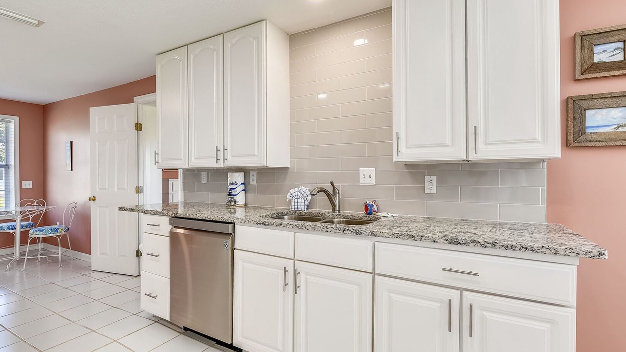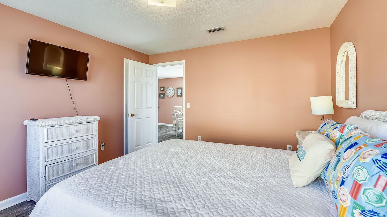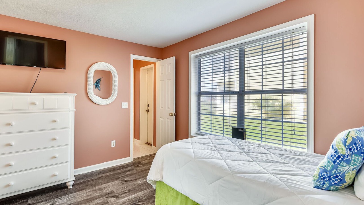 The private dining area features a coastal table and décor, creating the perfect ambiance for family and friends to gather and enjoy meals together. The master bedroom features a king size bed, a flat screen TV, and an ensuite bathroom with a walk-in shower. Bedroom 2 also has a king size bed and a flat screen TV, while Bedroom 3 offers a queen size bed and a flat screen TV. Bedroom 4 has 2 twin size beds and a flat screen TV. There are 2 additional bathrooms with walk-in showers, ensuring everyone has plenty of space and privacy. Other amenities of Coral Cottage include a washer and dryer, ensuring you have everything you need for a comfortable and convenient stay.