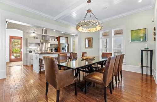 This home offers substantial living space for each member of your group. Children, in-laws, and teens will each have a place to reside on one of the three screen porches, which offer fantastic partial bay views, or two living spaces (the third floor tower offers seating and an entertainment area, perfect for the young ones in your group). The open floor plan kitchen, main living and dining areas converge on jaw-dropping details like wood detailing on the ceilings and walls and high end kitchen finishes like a Viking appliances and natural stone countertops.
