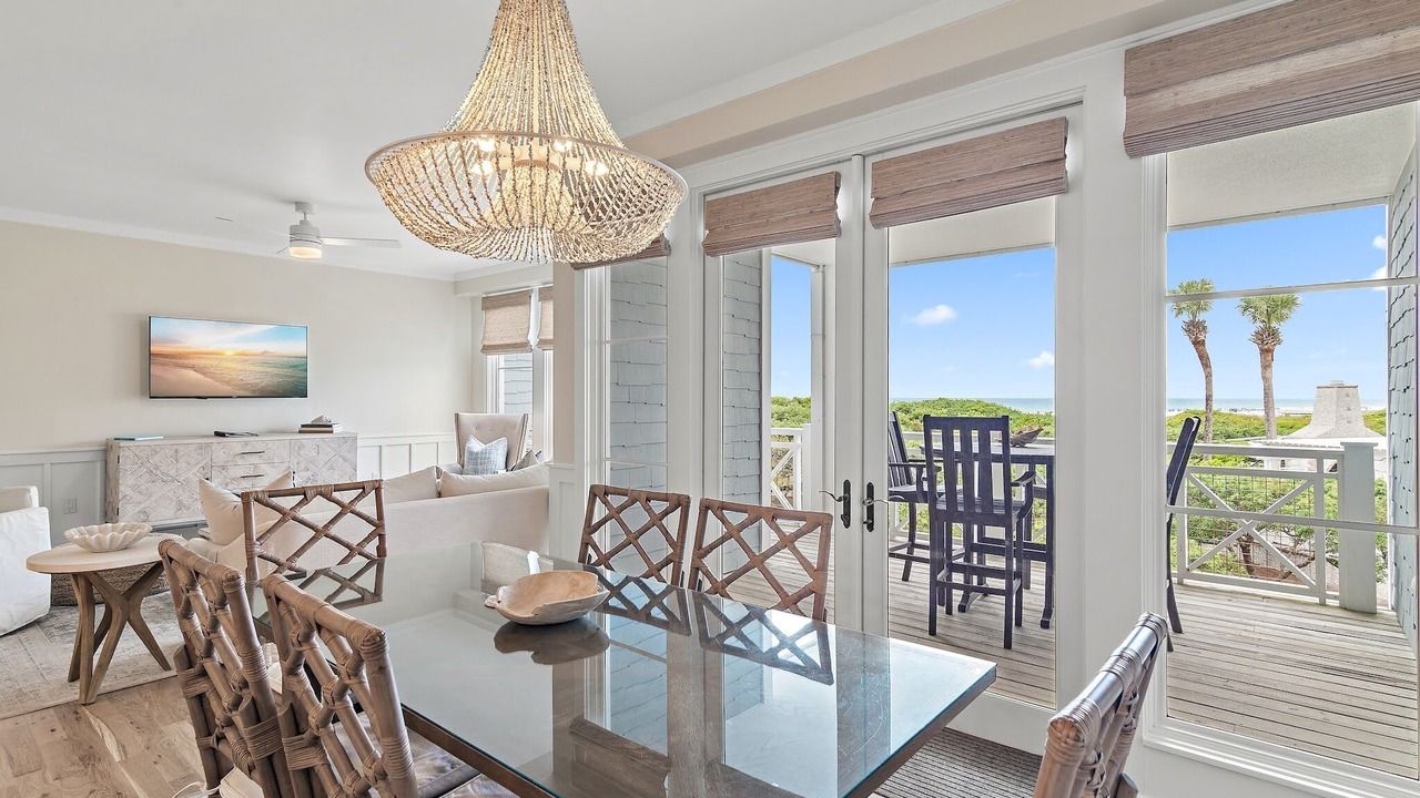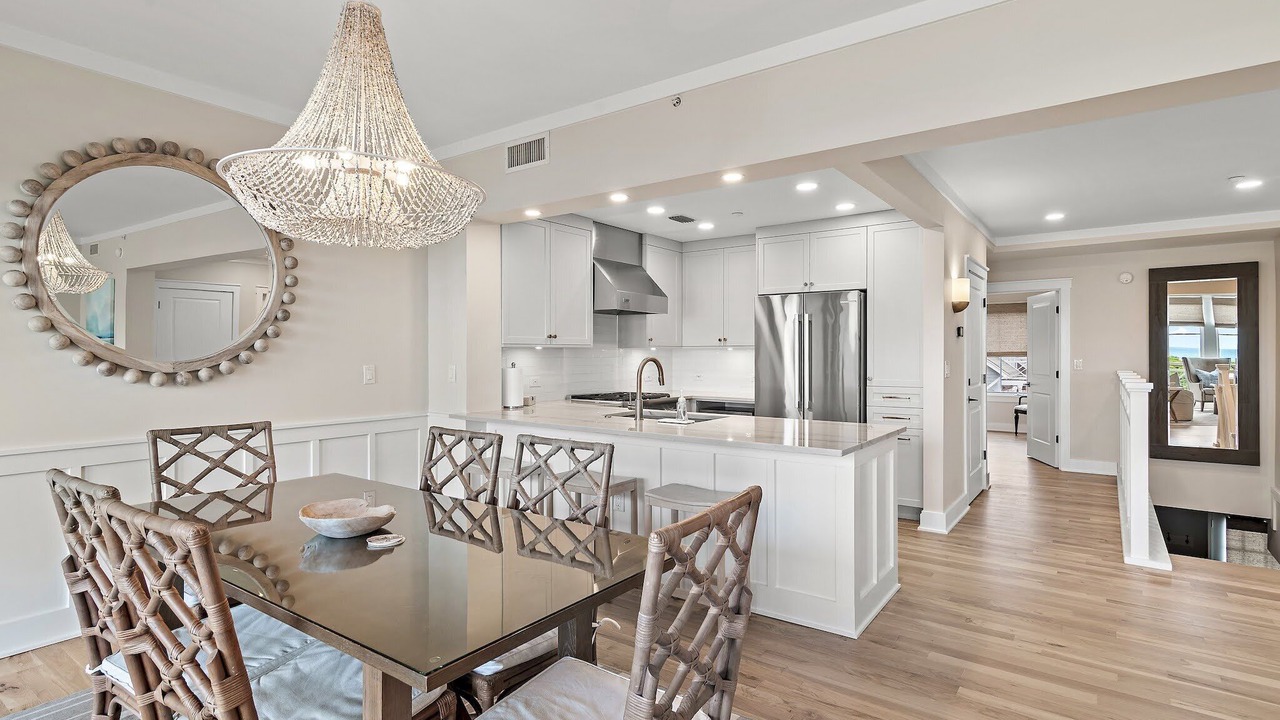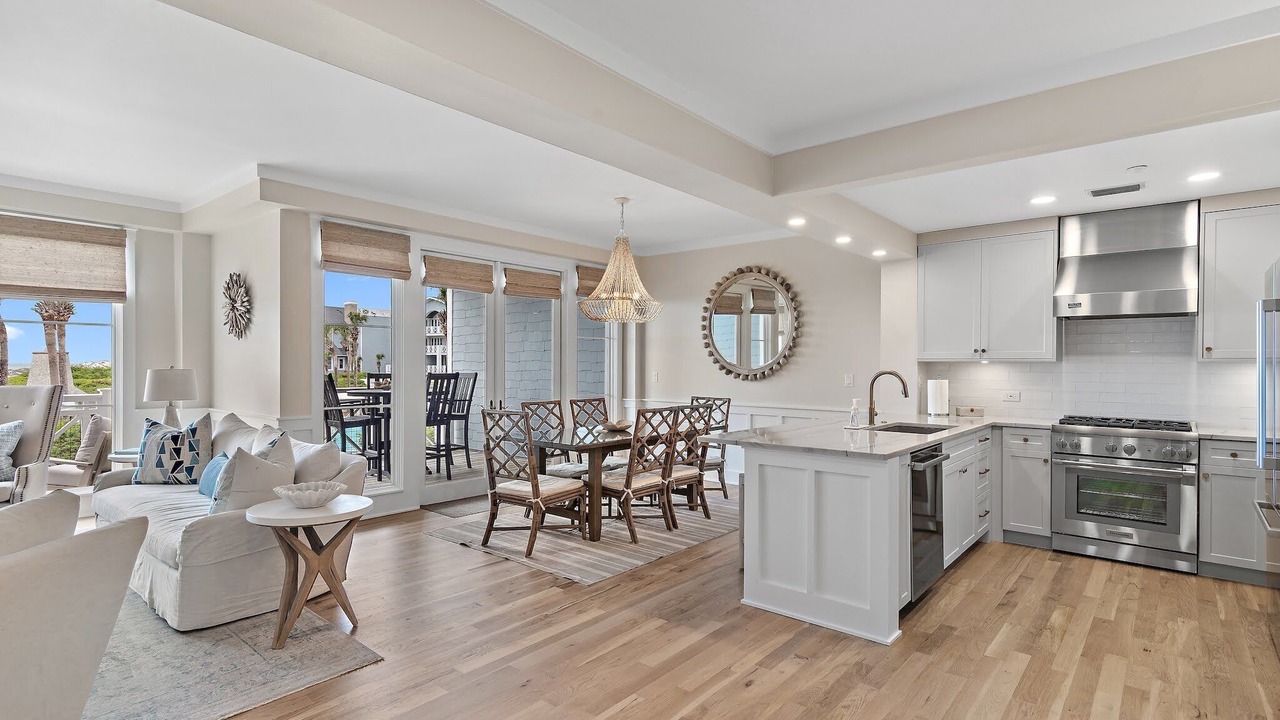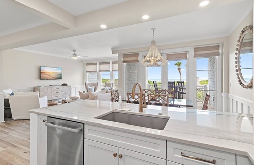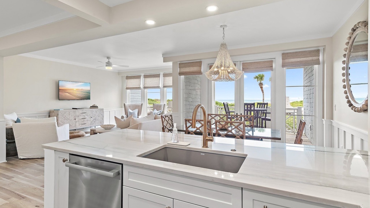 The separate but connected dining and living areas allow for all the relaxing or entertaining you can think of. The large flat-screen TV is visible throughout, so no one will miss the last play of the game or any scene of a movie… But you are right on the beach, so be prepared to be distracted by the breath taking views of dunes and ocean that extend the length of the main level. You will want to step out to the balcony to feel the salty breeze, the warm sun, and hear the endless ocean’s song, which will draw you back, year after year. Paradise.