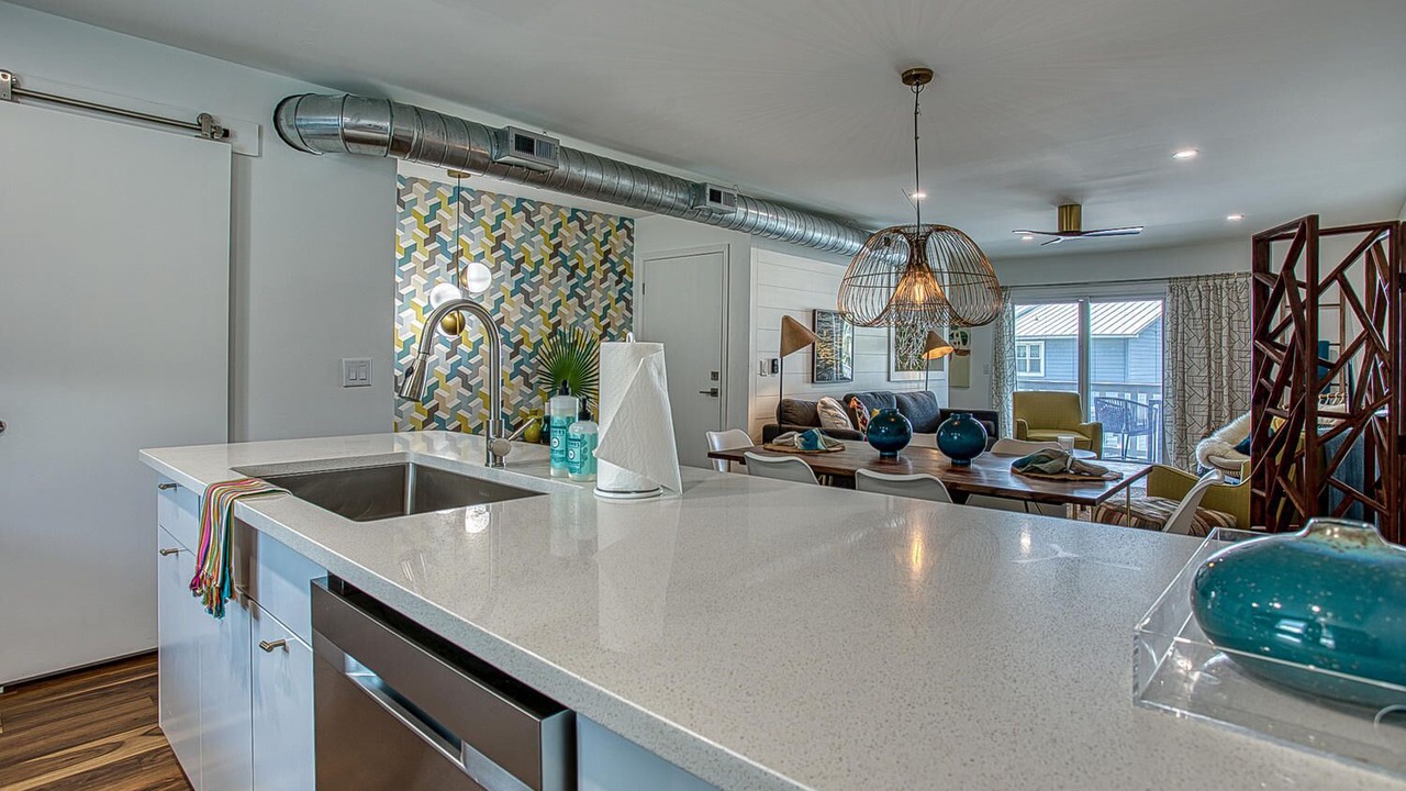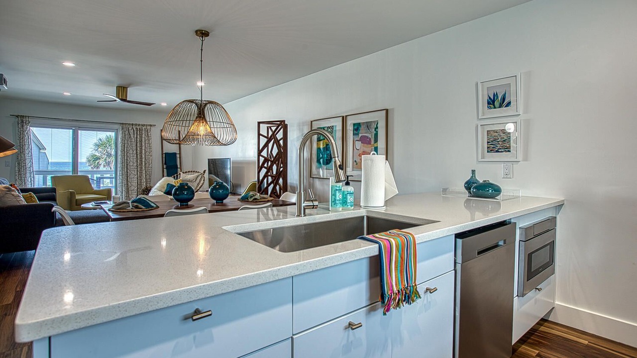 Enter the second floor and find an open concept kitchen and living room with a great pocket view of the Gulf. The kitchen is fully equipped and features dining space for six, stainless steel appliances and quartz countertops. The living area is bright, modern, and comfortable. Dine or lounge on the balcony, listen to the waves, feel the breeze, and take in the view. This floor also has a half bath.