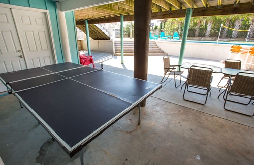 Stepping through the french doors from the family room onto the large balcony outside you are immediately wowed by the main attraction of this home. The large gunite saltwater pool allows enjoyment for all ages. There is a spacious 1' landing perfect for the toddles to play, two in pool staircases providing easy entry, bench seating as well as the swim-up bar provides multiple seating areas. Jump out of the pool and enjoy a game of volleyball or badminton on the grass court, or try your hand at horseshoes. Sunbathe on the pool deck, gaze out at the ocean views from the upper deck, or take shelter from the sun on the lower shaded patio which is great for hiding from the sun and playing in the sand with bucket and shovel in hand. This is also the spot to fire up the charcoal grill for the family cookout, which is adjacent to the homes additional recreation space with ping pong table.