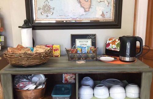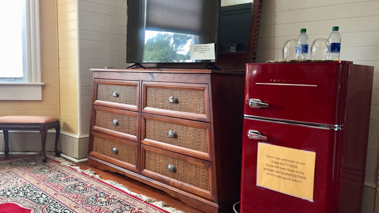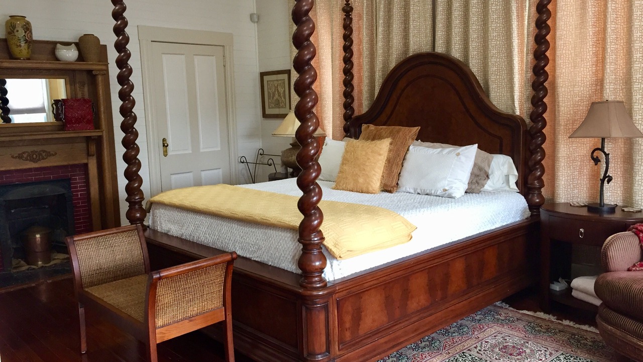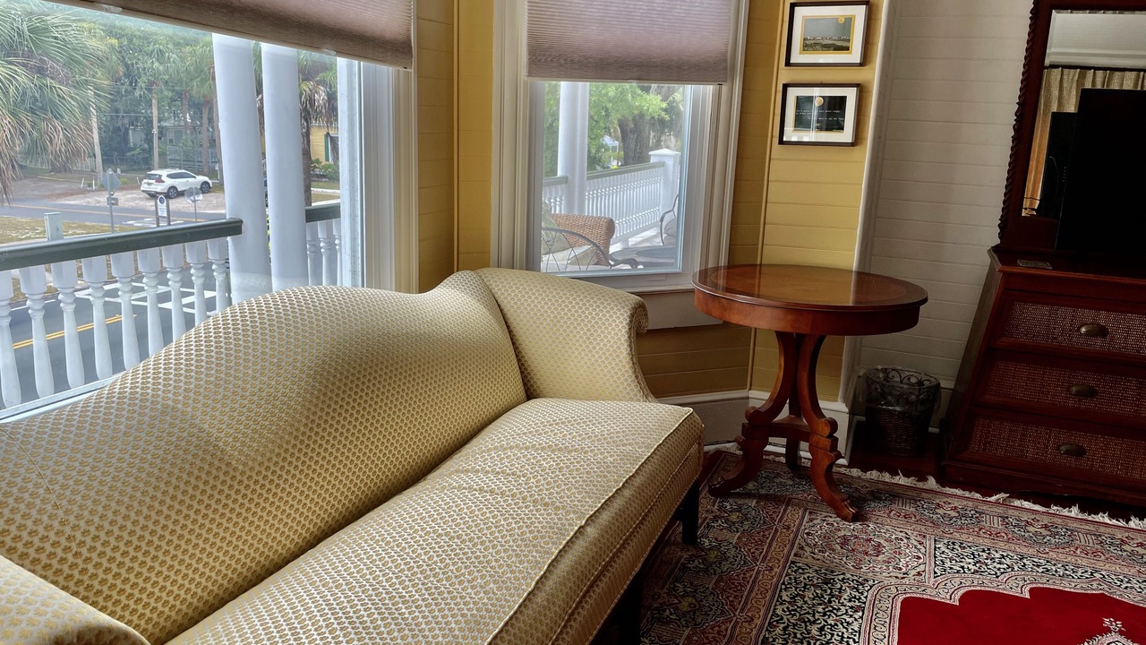 The AUTUMN MOON SUITE is a huge suite on 2nd floor of the Majestic Jewel Inn, located just blocks away from Historical downtown. It is bright & sunny with an amazing view from the bay window which is flanked with room darkening drapes. Beautifully furnished with a very comfortable KING SIZE bed, camel back sofa & chair, smart tv (but no cable) & small fridge. The addition of a modern bathroom with tiled shower completes the suite. It opens up to a shared living room & access to the sitting area on the upper veranda. Six other suites & a Hospitality Lobby, Kitchenette, Grand Salon & Dining Room are available for guests to enjoy. Although we are NOT a B & B, we do supply guests with self-serve coffee, tea, cold drinks, bottle water, milk, cereal & oatmeal PLUS an excellent environment to mix & mingle or simply relax! Please view our photos & the captions will give you more info about our other suites at the Majestic Jewel Inn!