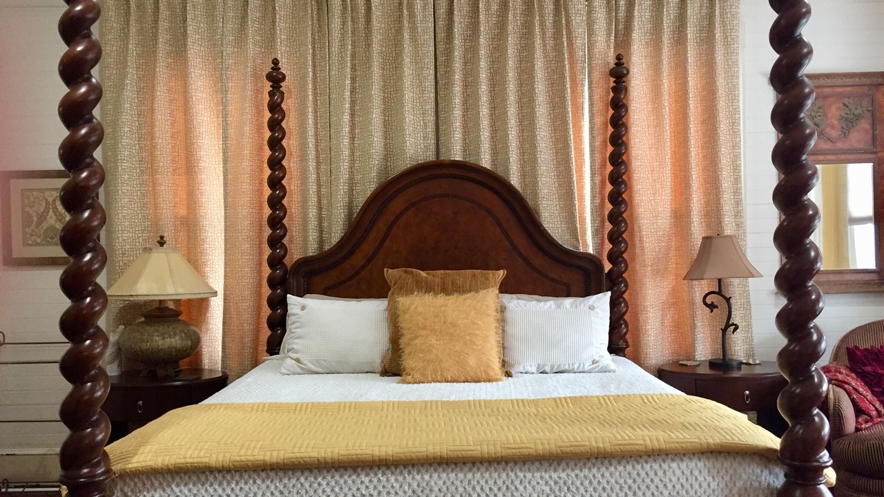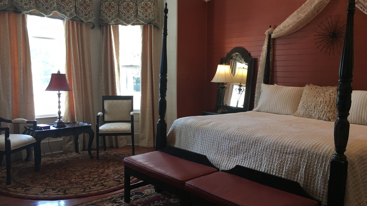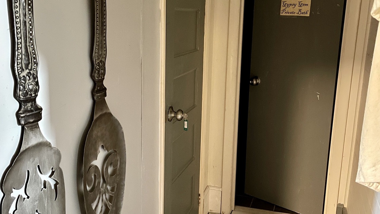 GYPSY GEM has a small half bath in room, the PRIVATE FULL BATH is across the living room and down a small hall. This room is beautiful with a queen size bed, fine linens, a full size sofa, big screen TV with cable and Netflix. Bright sunny room with a great view of Historical Church and the Historical Chapman House, opens up to a shared living room and upper veranda.