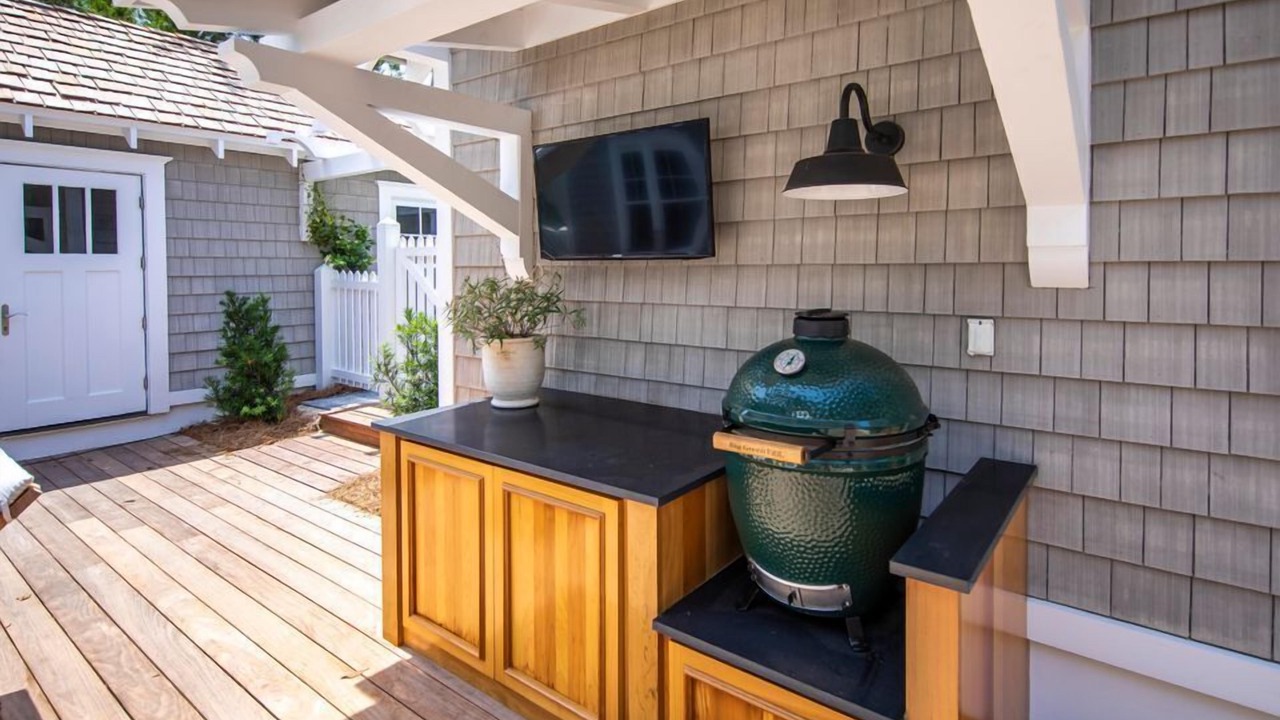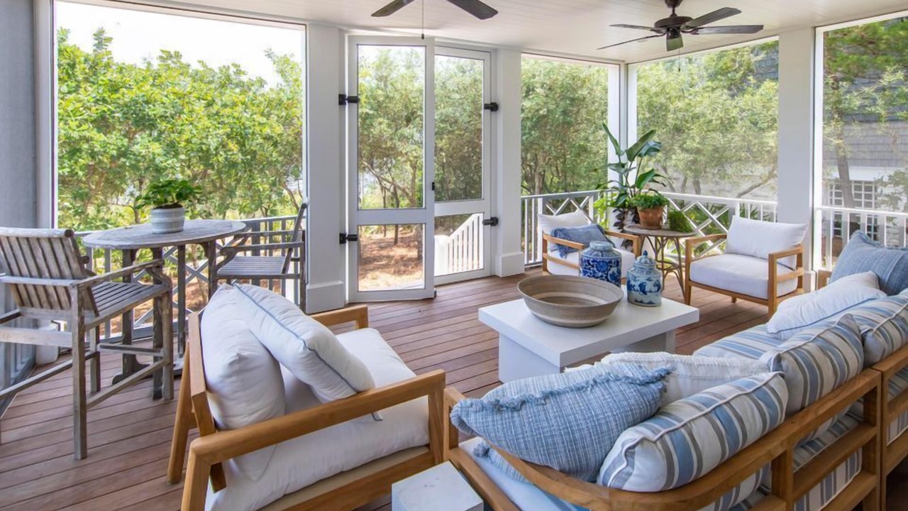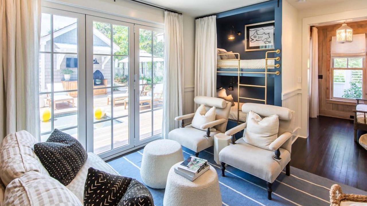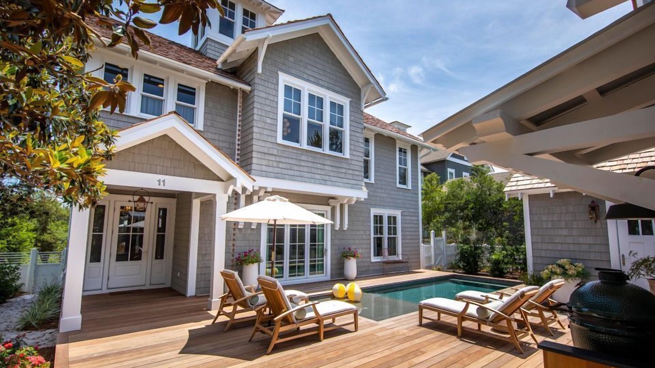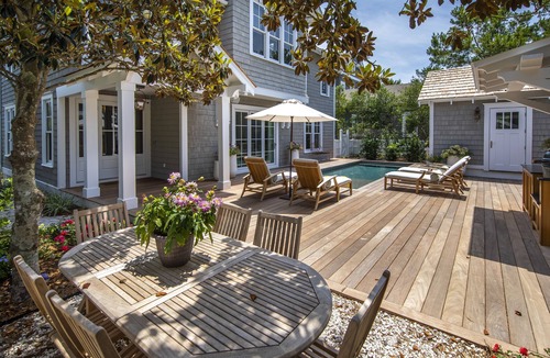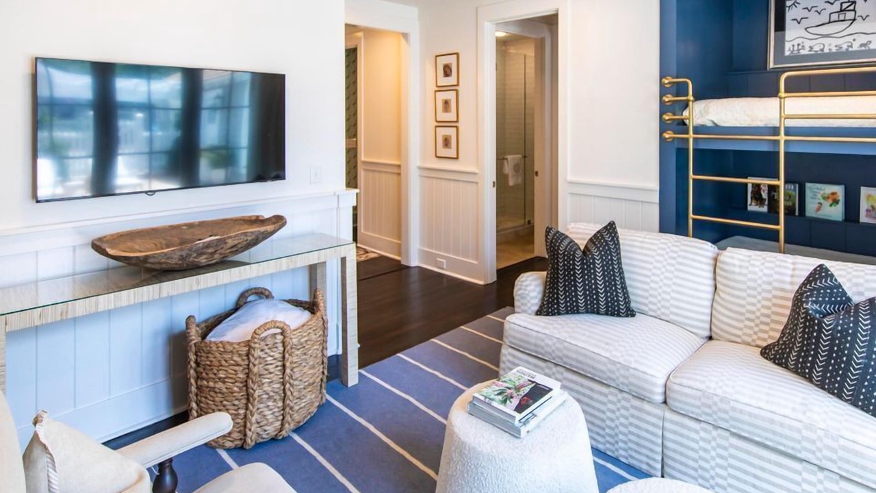 Returning from nature, the expertly landscaped scrub oaks provide shade and privacy to the first floor, screened back porch - a truly welcome respite regardless of season. The outdoor amenities continue in the private courtyard. The newly constructed pool is one of the largest in the community, featuring a tanning ledge and long-lasting IPE planking deck surround. The covered barbecue area includes a flat screen television and Big Green Egg smoker atop black soapstone counters. A cypress front foyer leads to a first-floor seating area flanked by yacht-inspired bunks of navy, brass, and creams. It's the perfect pool house feel with NanaWall access to the courtyard beyond. This flexible space can act as a standalone room or share a jack-n-jill bathroom with one of three guest suites on the same floor.