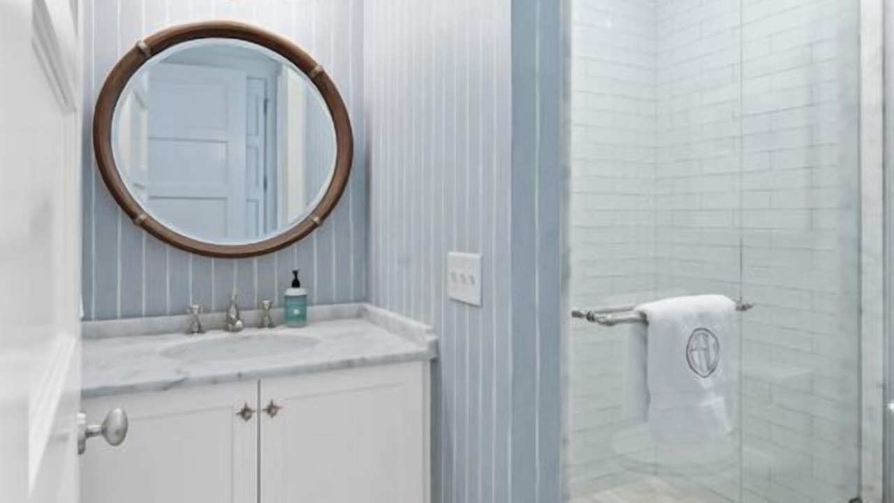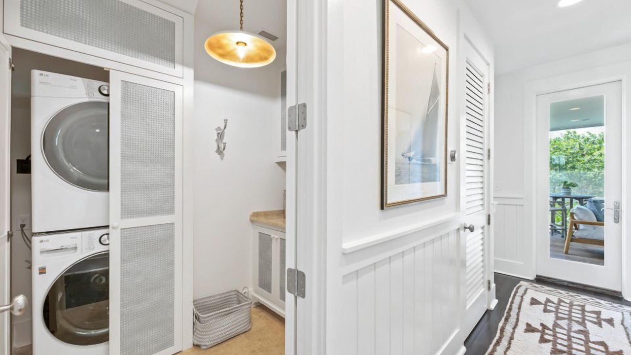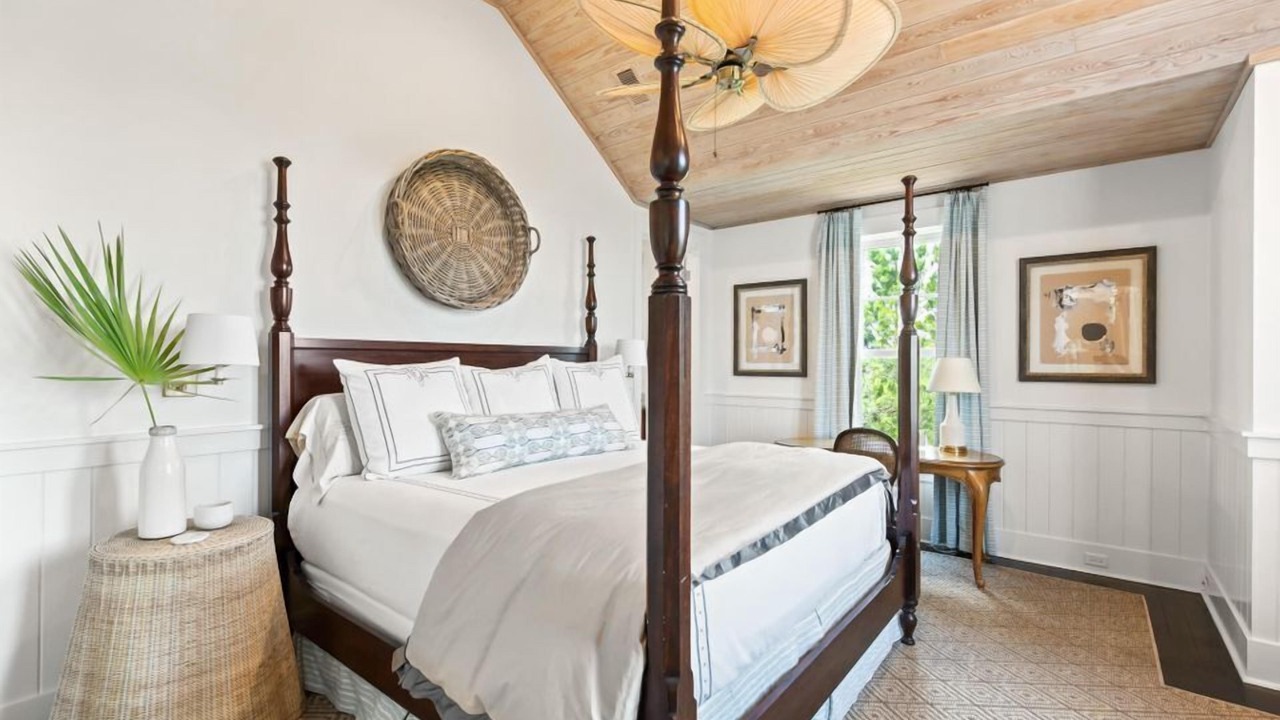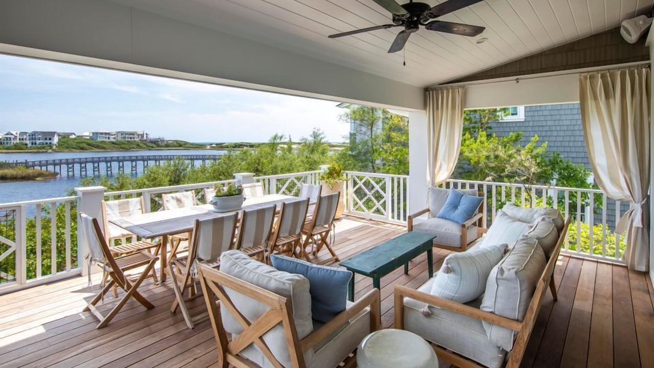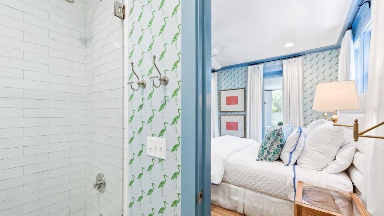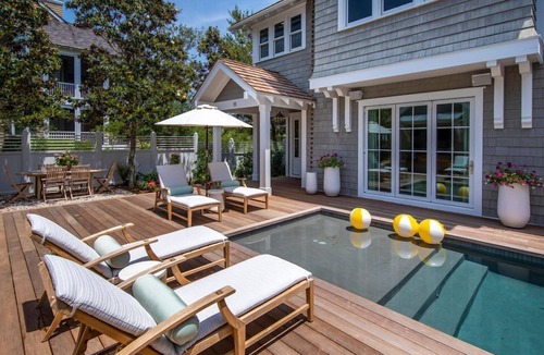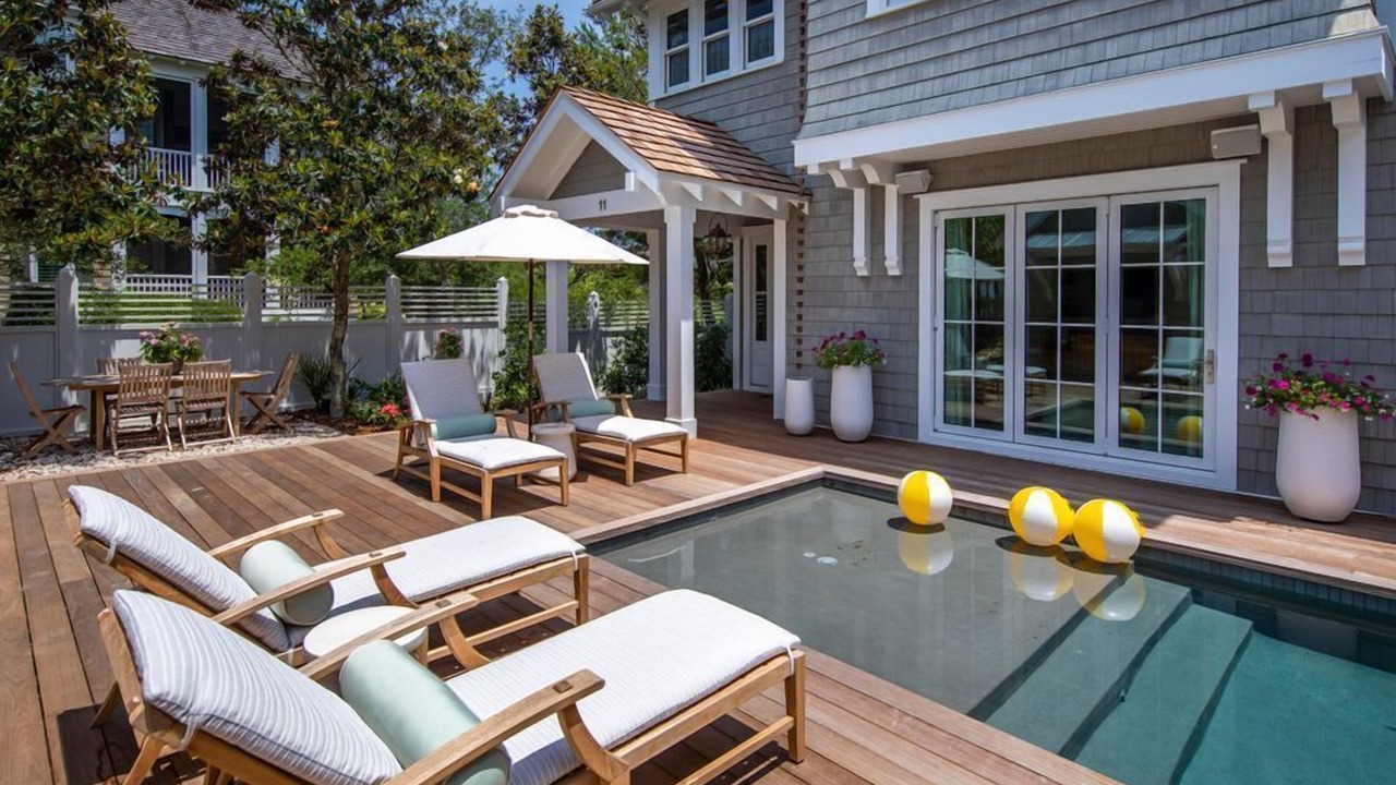 Returning from nature, the expertly landscaped scrub oaks provide shade and privacy to the first floor, screened back porch - a truly welcome respite regardless of season. The outdoor amenities continue in the private courtyard. The newly constructed pool is one of the largest in the community, featuring a tanning ledge and long-lasting IPE planking deck surround. The covered barbecue area includes a flat screen television and Big Green Egg smoker atop black soapstone counters. A cypress front foyer leads to a first-floor seating area flanked by yacht-inspired bunks of navy, brass, and creams. It's the perfect pool house feel with NanaWall access to the courtyard beyond. This flexible space can act as a standalone room or share a jack-n-jill bathroom with one of three guest suites on the same floor.