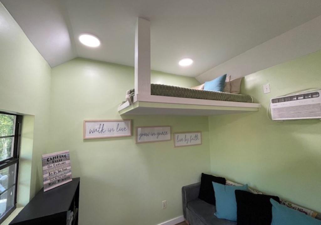 La Casita is perfect for two adults and up to three children, a romantic getaway for two, or even a weekend get away for besties! Completely brand new with a queen sized pull out couch bed, a queen sized loft-styled bed, and a full sized bunk-styled bed! Even equipped with a 7.5 cubic foot fridge, a full bathroom with small walk-in shower, and even a small kitchenette area. Added features include outdoor shower, firepit, BBQ grill, full access to large pole barn and Bear Creek.