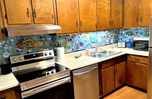 Inside there is an updated kitchen with all new appliances. It has been decorated with a snappy mosaic backsplash and is fully equipped. Pots and pans, dishes, dish towels etc.