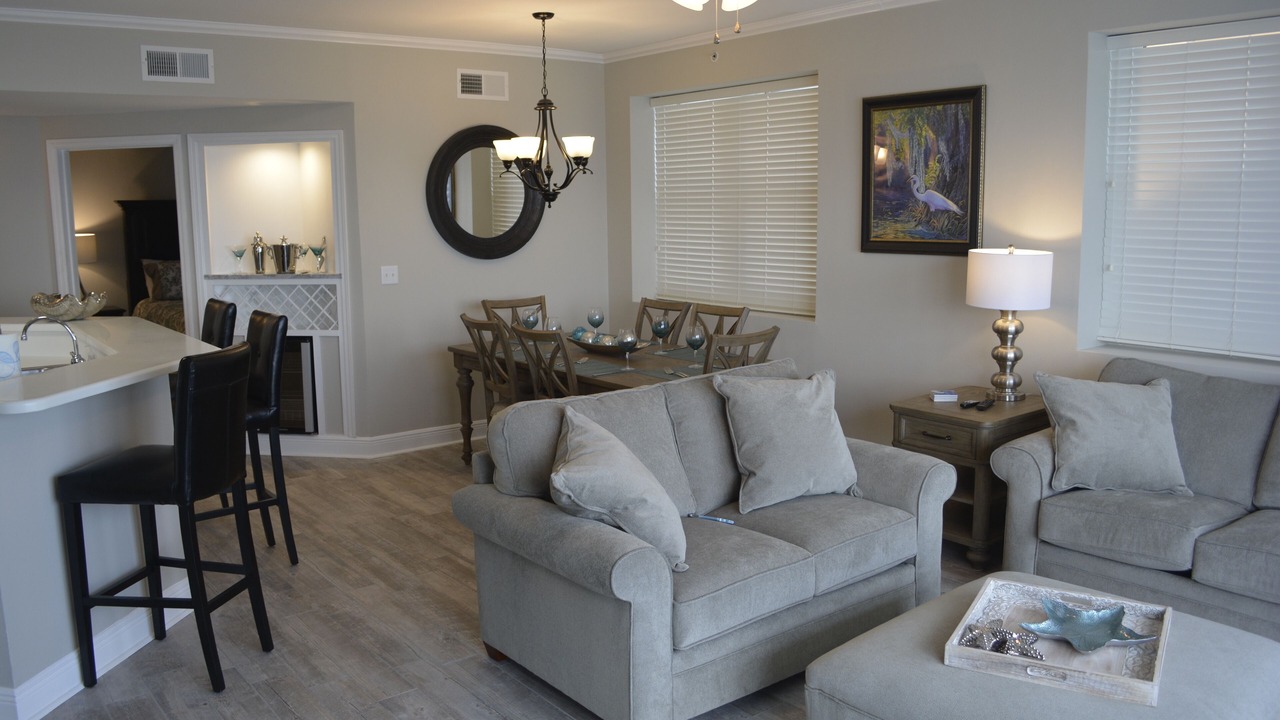 Every room in Celadon 1401 is special. The living room is well furnished. It features a comfortable queen sleeper sofa, love seat and a flat screen television.