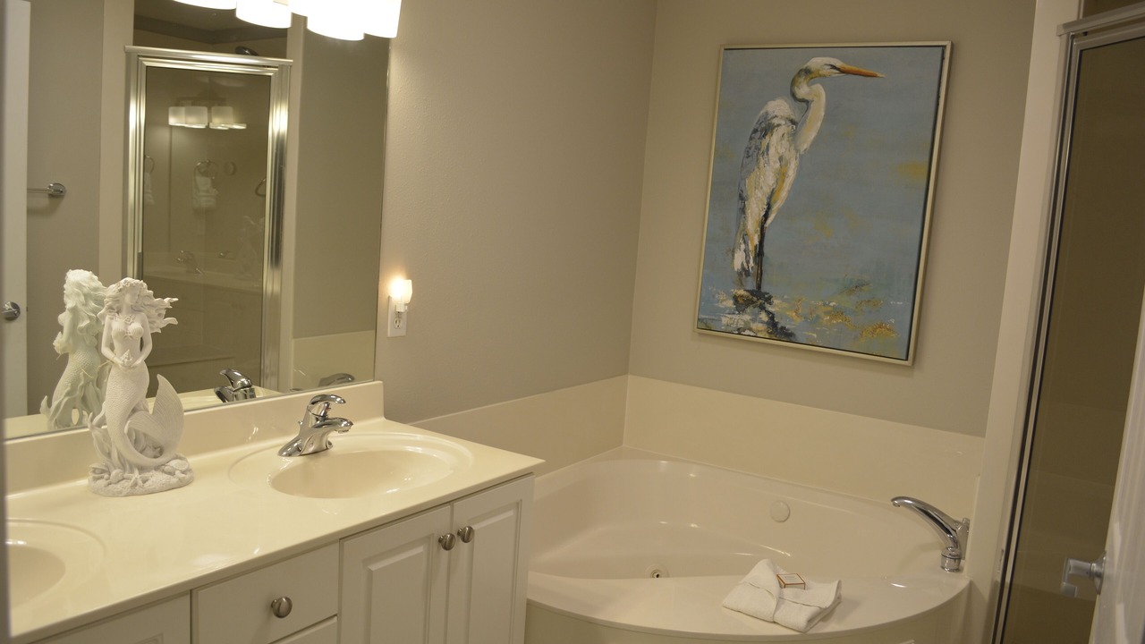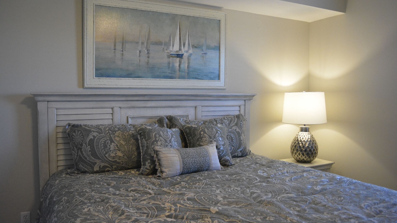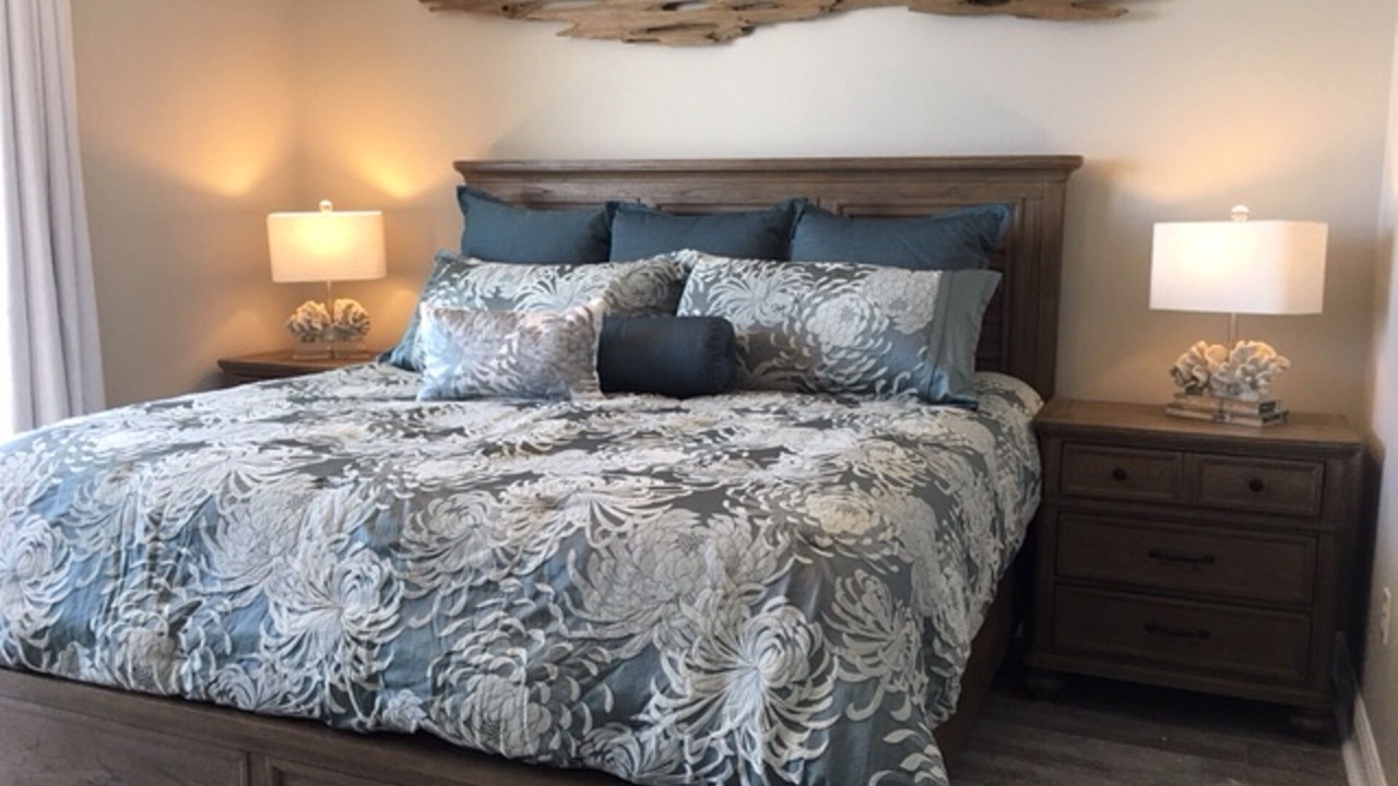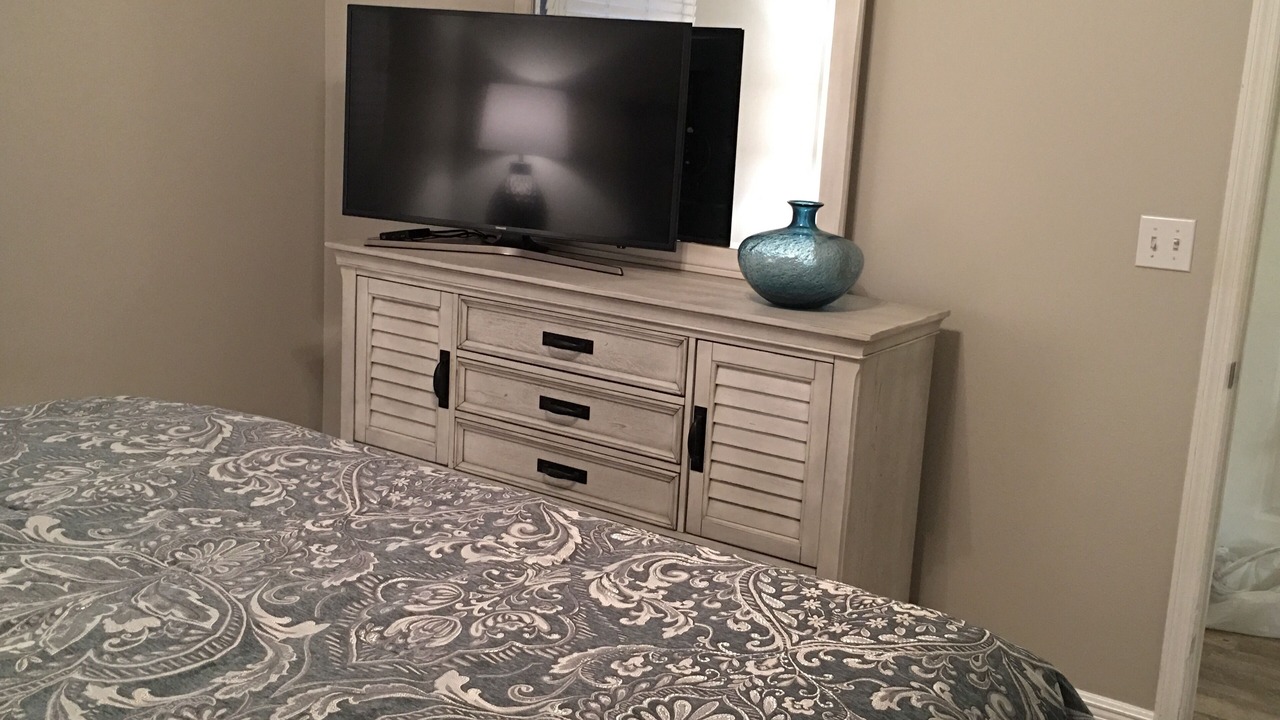The MASTER SUITE features a luxurious KING bed and private bath. There’s plenty of space to store your beachwear in the spacious walk-in closet. You’ll notice the 58' flat screen TV. It makes for great viewing when you’re relaxing after an fun filled day at the beach. You also have a private entrance onto the wrap around balcony!