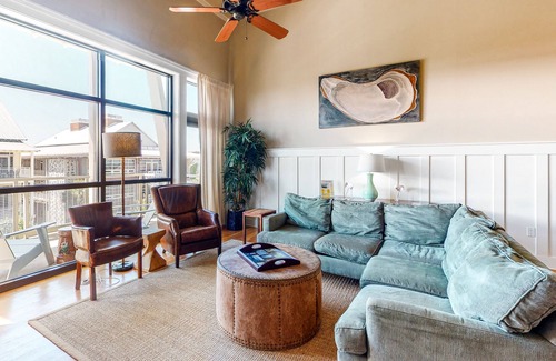 Open and clear with high ceilings, this condo is all set up to welcome you to your beachside vacation. Enjoy a retreat in this tastefully decorated space, fully of carefully curated nods to the natural beauty of the area. The enclosed balcony is perfect for taking in fresh air - it's covered to ensure guests will be able to relax in the shade. The full kitchen features luxury touches like a farm sink, dishwasher, and plenty of space on the stone counters to help you prepare a tasty meal. Eat at the breakfast bar for an informal meal, or come together in one of the many seating areas. A desk workspace near the front door will help in case anyone needs to complete remote work or speeding. When you're ready to go out and explore, guests can enjoy access to the shared outdoor pool, fitness room, and outdoor shower.