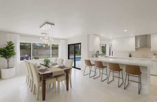 This residence is bathed in natural light, with sun-filled rooms seamlessly opening to an expansive pool and a secluded fenced-in backyard, creating a seamless blend of indoor/outdoor living. The interior features a pristine white kitchen with a oversized island and a dining room comfortably accommodating 8 guests. Your entertainment desires are met by the integrated indoor/outdoor Sonos system, while the property offers amenities such as a grill, floats, and bikes for your leisure. Smart TVs in every bedroom and the living room, coupled with a Sonos soundbar, provide a cutting-edge entertainment experience.