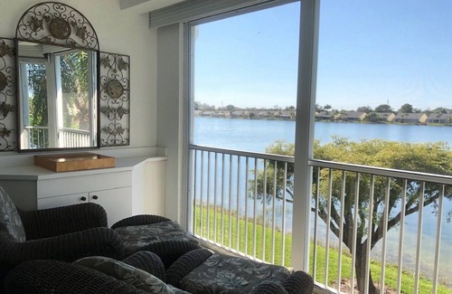 Second floor large condo with lakeside view. Open floor plan with 2 bedrooms and 2 full bathrooms. Stylishly decorated and recently updated. Includes connected private garage, washer/dryer, fully equipped Kitchen with adjacent Dining room. A separate den for reading and entertaining. Also a large private balcony to take in the stunning daily sunsets over the 47 acre lake. Master bedroom has a king bed with walk in closet and private bathroom with shower. Second bedroom has queen bed with secluded access to second full bathroom. Internet, Cable and Electric Included. Tenants have access to development heated pool, sauna, tennis courts w/ pickle ball and gym. 3 mile paved bike/jogging trail and 1 mile leisurely walk/drive to Starbucks coffee, restaurants and shopping. Only 4.2 miles to the amazing Naples beaches and fabulous 5th street in downtown Naples Florida. Very quiet and relaxing space.