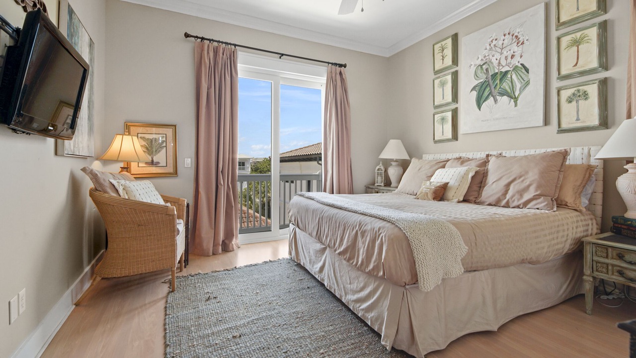 * Ground floor has 3 rooms - two very large living/sleeping rooms (3 double futons, a queen and a queen sleeper sofa) and bath, 2 bunks and a trundle. Plenty of room for children in entertainment/bunk room plus a new bonus room. Main floor contains study/sleeping room, bath, washer/dryer, and large kitchen, dining and comfortable family room and a huge deck with views of PC and Destin skylines. Top floor has a beautiful master bedroom suite, large bathroom with jetted tub, large closet, room for a crib, and magnificent balcony to watch beautiful Gulf sunsets and views up and down the beach. a king and a queen bedroom, one with private balcony with views of Rosemary, Alys and Seacrest and our private heated pool. Carriage house has own kitchen, washer/dryer, sitting area, 2 beds-queen and double, and private balcony overlooking the gulf and the pool. This is our second home and is furnished accordingly.