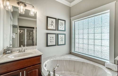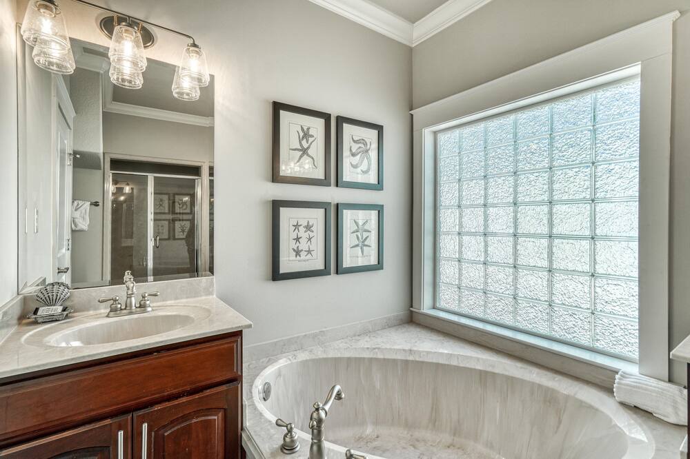 ~ 1st Floor Master Bedroom with King Bed & Private Bathroom with Soaking Tub, Walk-In Shower, & Double Vanity